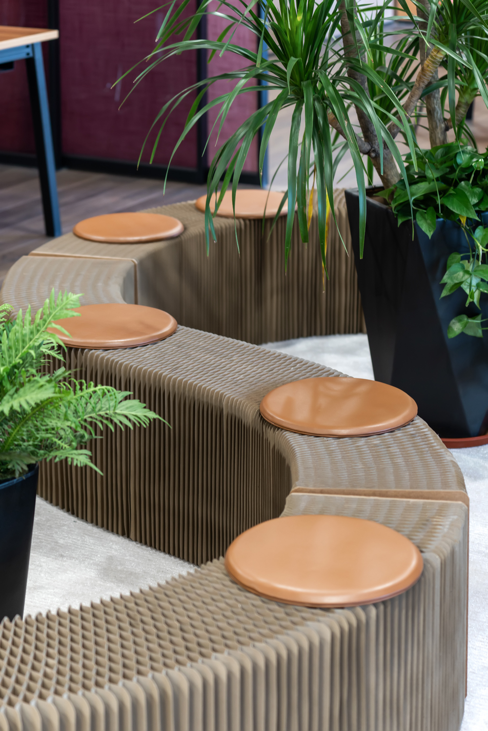 裝置互動區(qū),采用s型手風(fēng)琴形態(tài)展示,在曲折回旋中梳理人文互動的脈絡(luò)。從初始到終結(jié),代表五行木文化的綠植一前一后,維系場域間的平衡與沉穩(wěn)。