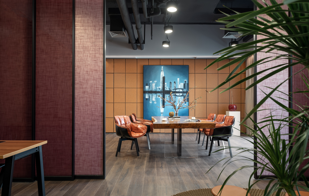 設(shè)計師認(rèn)為辦公空間的設(shè)計也應(yīng)該是溫暖的、充滿關(guān)愛的,通過空間的靈活切換為客戶創(chuàng)造更多的商業(yè)價值。墻面以磁性黑板漆穿插其間,實現(xiàn)視覺上的層次迭代。薄暮紫夾絲玻璃推拉門實現(xiàn)了會議室與辦公區(qū)的自由切換,開放式空間為來此進行房產(chǎn)咨詢的精英人士提供了線下答疑、培訓(xùn)學(xué)習(xí)的平臺,成就雙方合作共贏的發(fā)展期待。
