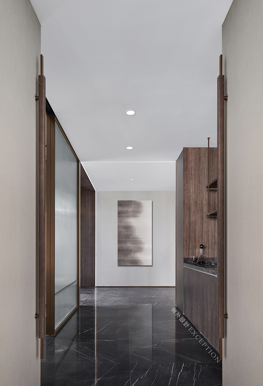 由前廳而入,空間以縹緲寫意的抽象掛畫開啟序章,清朗簡(jiǎn)約的線條勾勒出端然有序的逸致。深沉穩(wěn)重的木飾面柜體集展示與收納于一體,同時(shí),大理石與黃銅組合的多功能茶桌豐富空間的場(chǎng)景層次,營(yíng)造區(qū)別于浮華淺表的東方純粹美學(xué)。