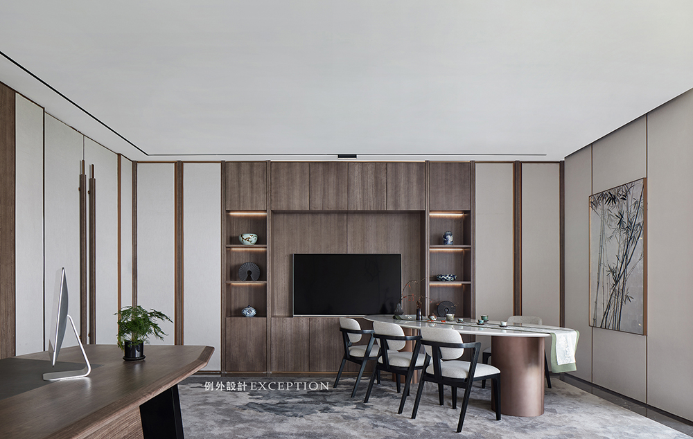休閑室延續(xù)了整體空間的設(shè)計(jì),點(diǎn)綴竹元素增加空間的文雅與詩(shī)意。窗外竹葉清翠,仿若一幅自然畫卷:岸邊竹影搖曳,倒映在水中,疏影橫斜,為空間增加一絲靈動(dòng)的美。在這里品酒、社交會(huì)客、棋牌休閑等,都是一種輕松自在的享受。
