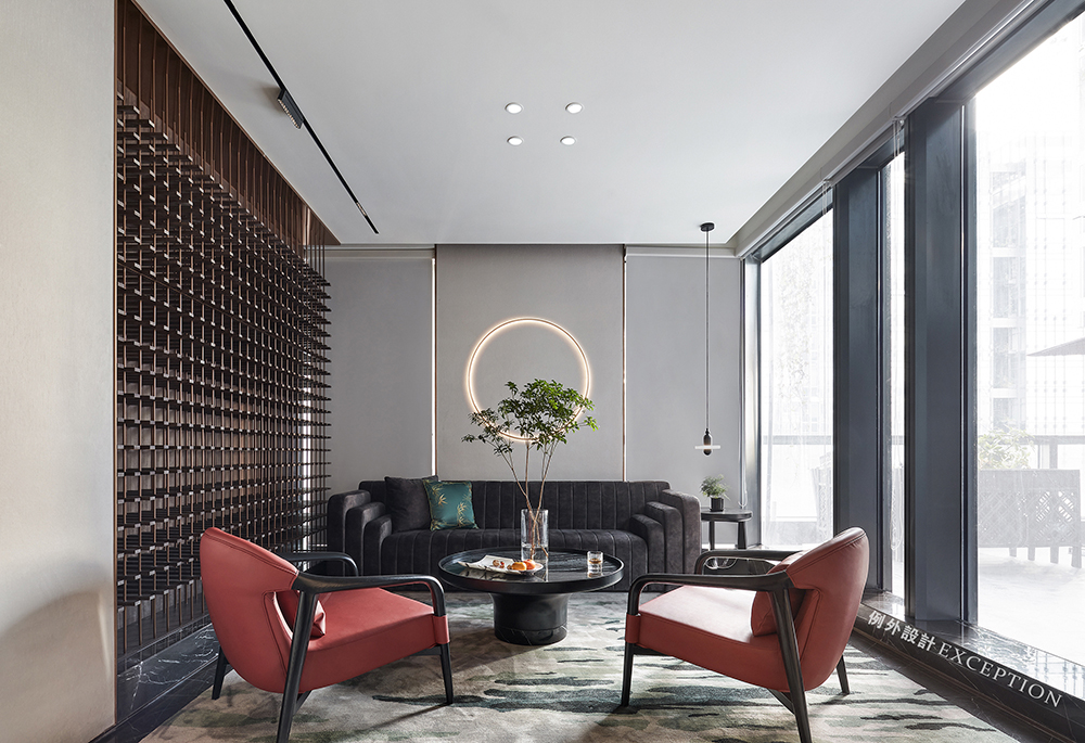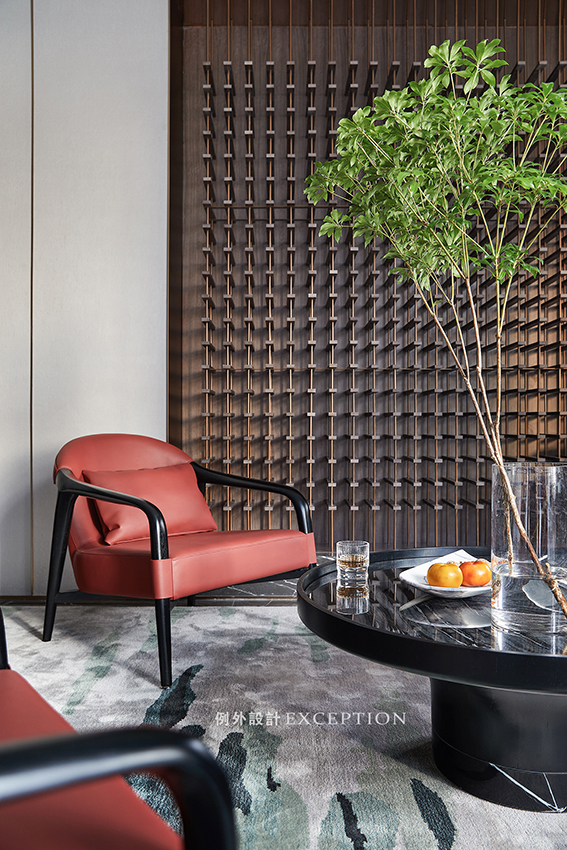 空間一角,幾枝青翠融入自然的生機(jī),緋紅與典雅綠構(gòu)成一幅和諧靜謐的畫面。肌理豐盈的山水紋幾面光影可鑒,賓客間談笑風(fēng)生,來杯威士忌微醺空間的輕奢節(jié)奏,設(shè)計(jì)于細(xì)微之處關(guān)照商務(wù)精英的社交需求,獨(dú)特清靜的空間氣度也宛若天成。