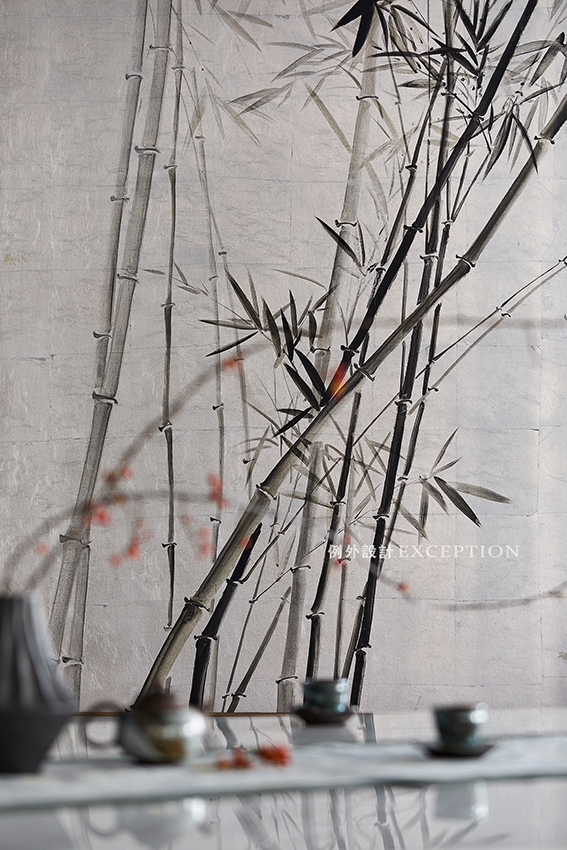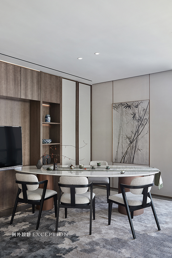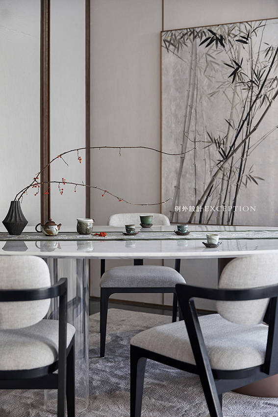 進(jìn)入空間,流淌的雅致和詩(shī)意縈繞心頭難以忘懷。一陣風(fēng)起,亭亭修竹婆娑而舞,茗煙裊裊升起,頗有魏晉文士竹林雅集的風(fēng)骨詩(shī)性。在木色與米白的淡然中,青瓷小物點(diǎn)染出空間的悠然與達(dá)觀,彰顯了曠遠(yuǎn)開闊的人生格局。