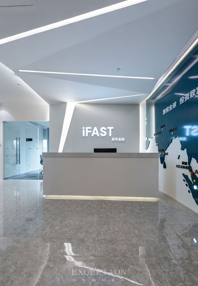 2、前臺處天花墻面一體鉆石切割面造型,延伸空間的同時凸顯科技感。