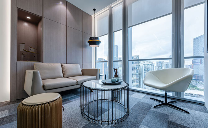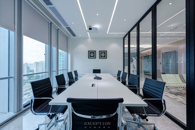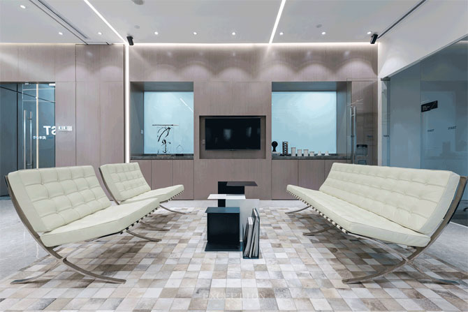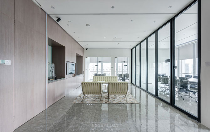 空間的顯與隱有著成百上千種表現(xiàn)形式,而光電玻璃將光、電、玻璃的功能相結(jié)合,展露出透明玻璃與磨砂玻璃不同的視覺體驗,實現(xiàn)了會客區(qū)與辦公區(qū)之間的通透可視與私隱的靈活切換。