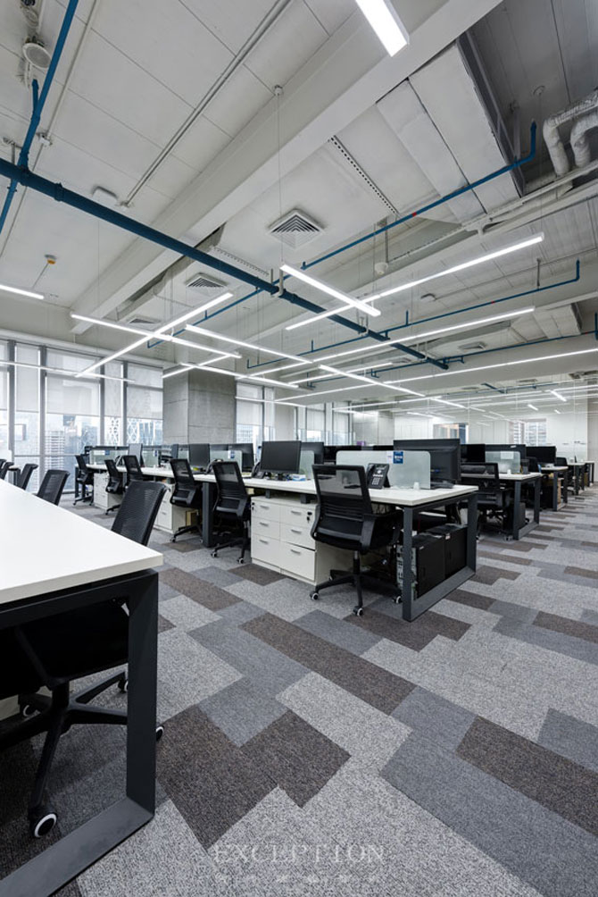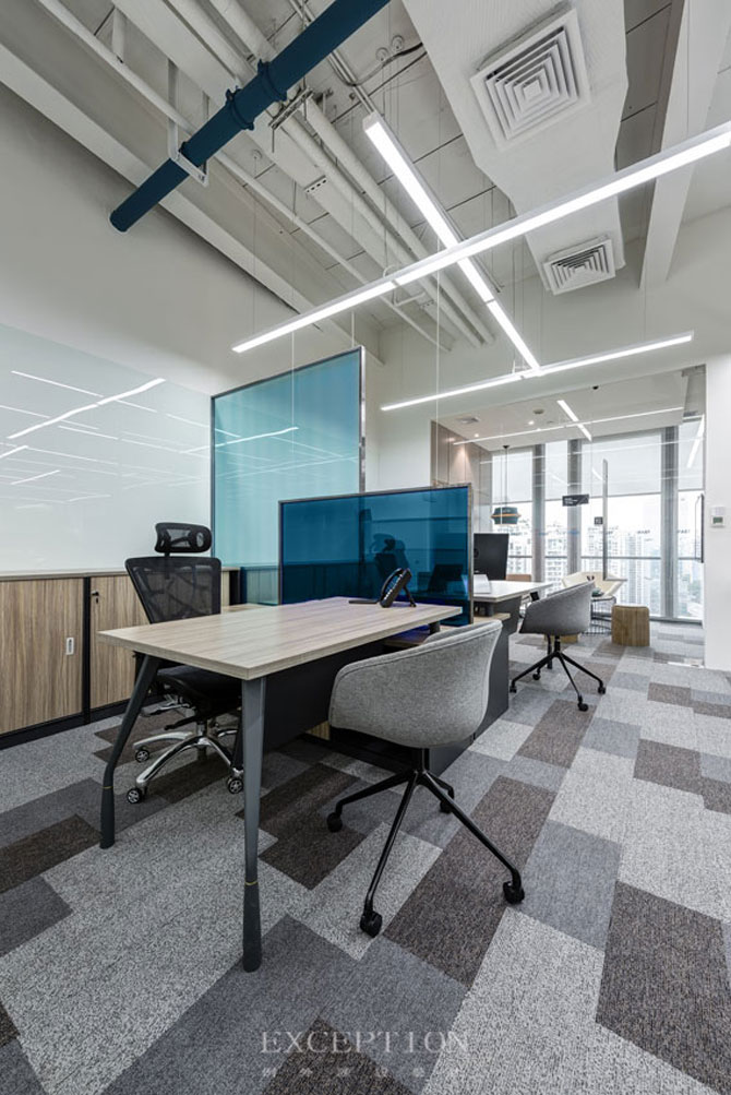 灰、白、咖為主的幾何拼花地毯錯落有致,在開放區(qū)無聲延續(xù)著安靜舒緩,唯恐驚擾認(rèn)真工作的人們。淺藍(lán)和靛藍(lán)雙色玻璃以縱橫排布的姿態(tài)點亮空間的同時也帶來鎮(zhèn)定心神的效果。