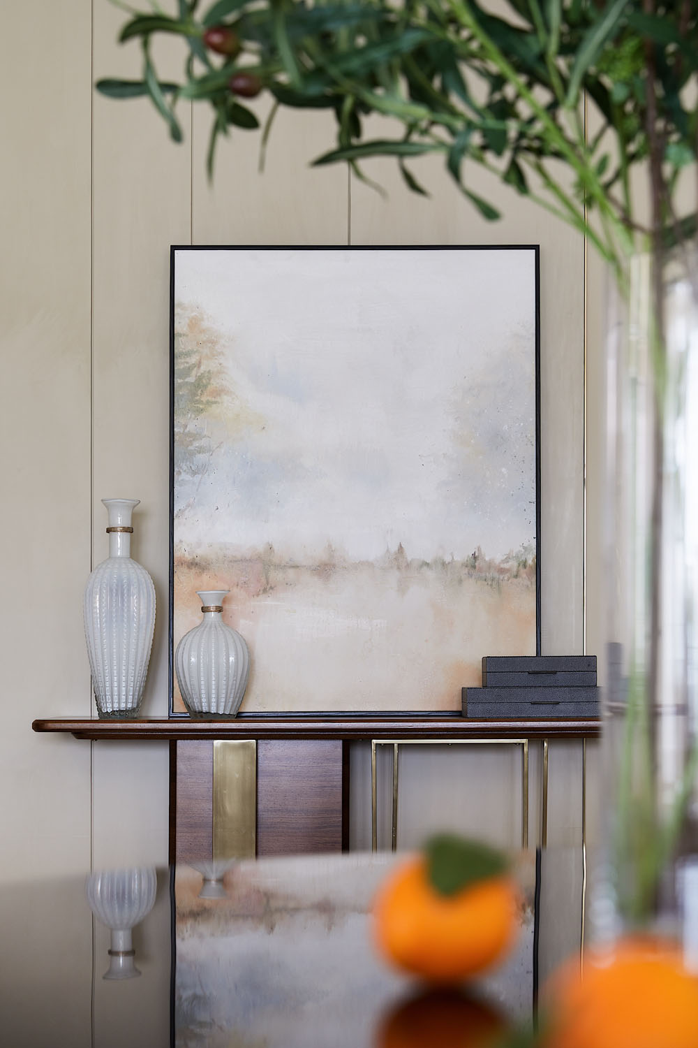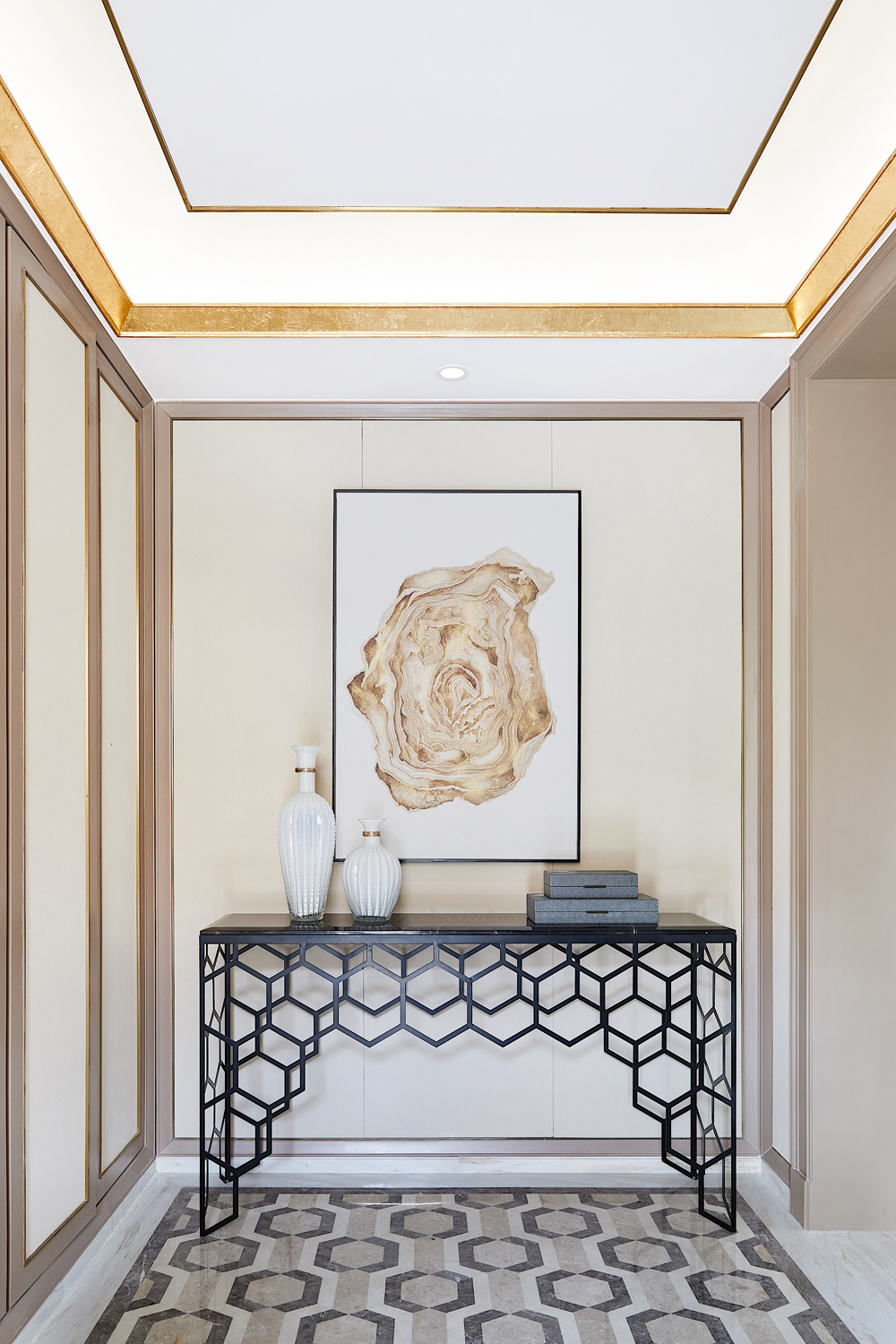 在玄關(guān),圍繞主題展開的蜂巢造型端景臺,通過幾何變換延伸出輕盈別致的藝術(shù)性。裝飾畫似金色玫瑰優(yōu)雅綻放,又仿若花蜜清瑩欲滴,恰到好處點綴了空間的視覺中心,勾勒出彬彬有禮的迎迓場景。