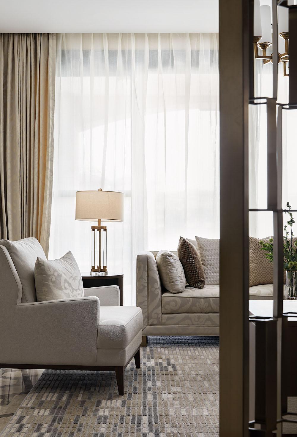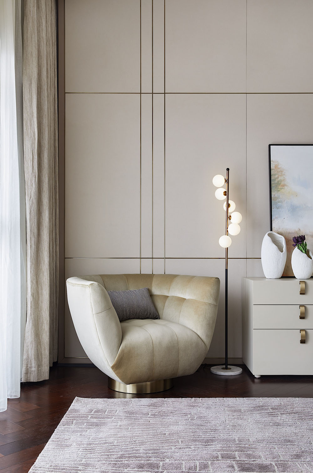 生活是精神意識的再現(xiàn),所謂的奢華,是拋開表象之后所獲得精神上的愉悅與清寧。米色的溫柔與金屬的質(zhì)感打造出素雅精致的藝境。清風(fēng)徐來,透過紗簾悄悄融入親朋間的溫馨家常。想象需要被預(yù)留空間,讓每一天都充滿未知的驚喜。