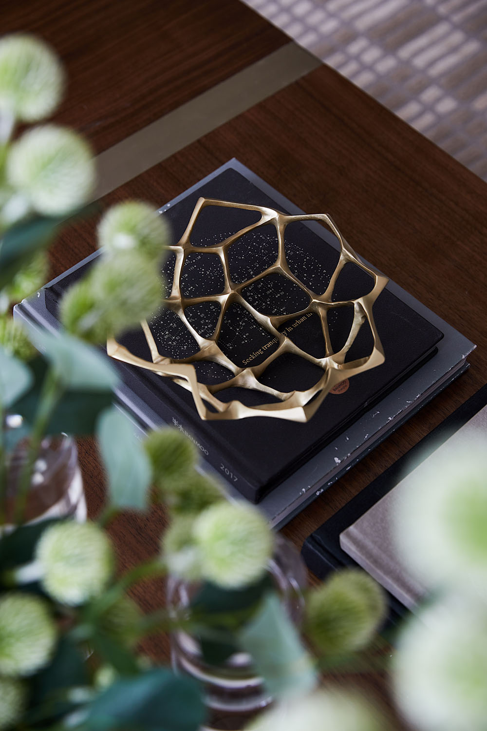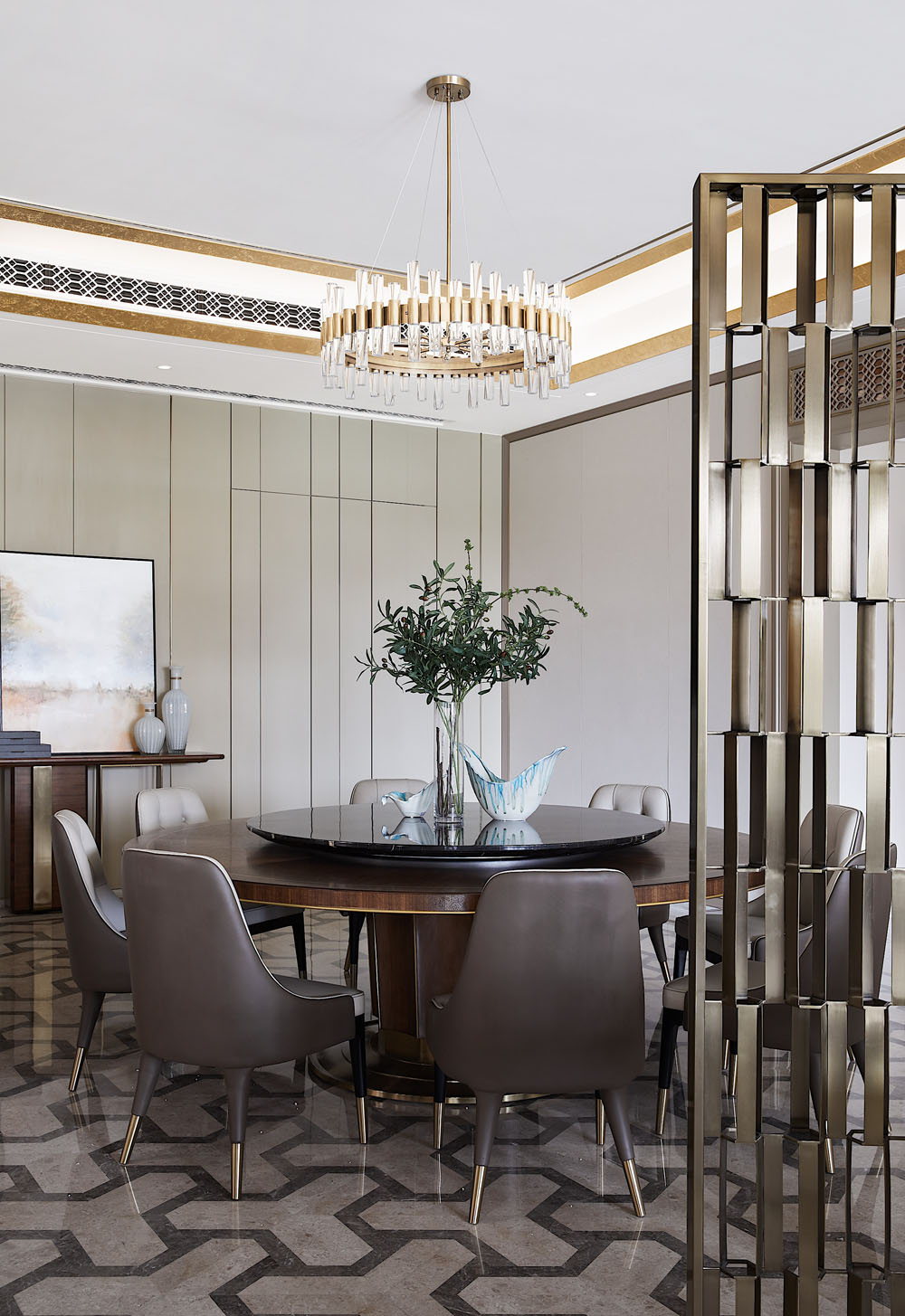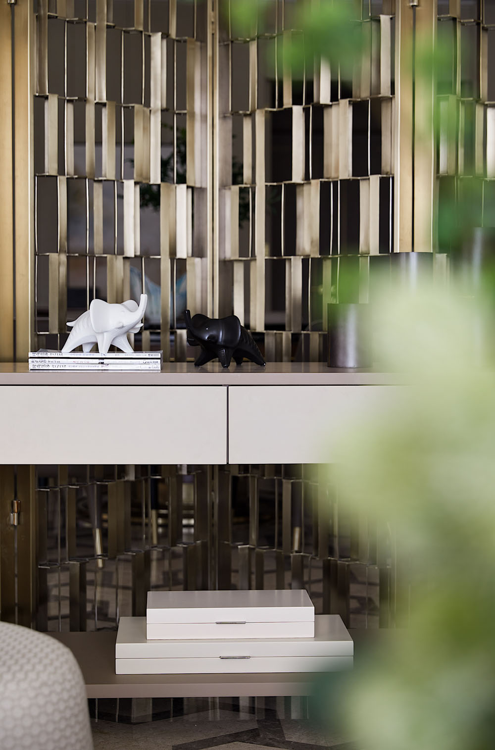“蜂巢”的靈感概念在空間不斷延續(xù),小圓墩上的暗紋肌理依舊能看出設(shè)計所想表達(dá)的家的凝聚力和安全感。金屬鏤空隔斷增加了視覺上的層次,和質(zhì)地考究的黑金碗蓮擺件一起讓家的精致氣息脫穎而出。