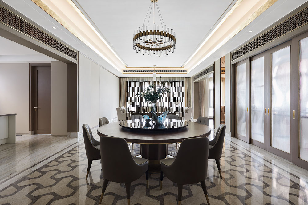 餐廳在米色的基礎(chǔ)上添加了更沉穩(wěn)端嚴(yán)的一筆,描摹家族的餐饗禮序。美是很抽象的東西,但生活的美好模樣卻可以具象。香氣誘人的料理端上桌,一家人聚在一起,水晶燈揮灑星光如水,于高朗的情境中悠然感受人間煙火氣。
