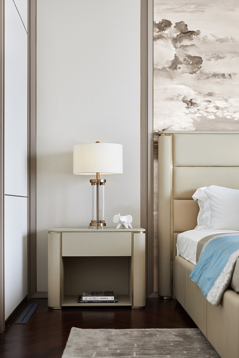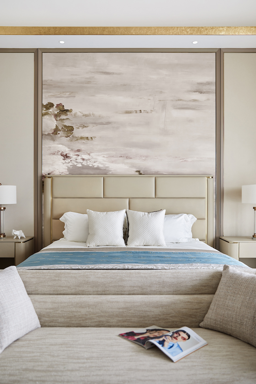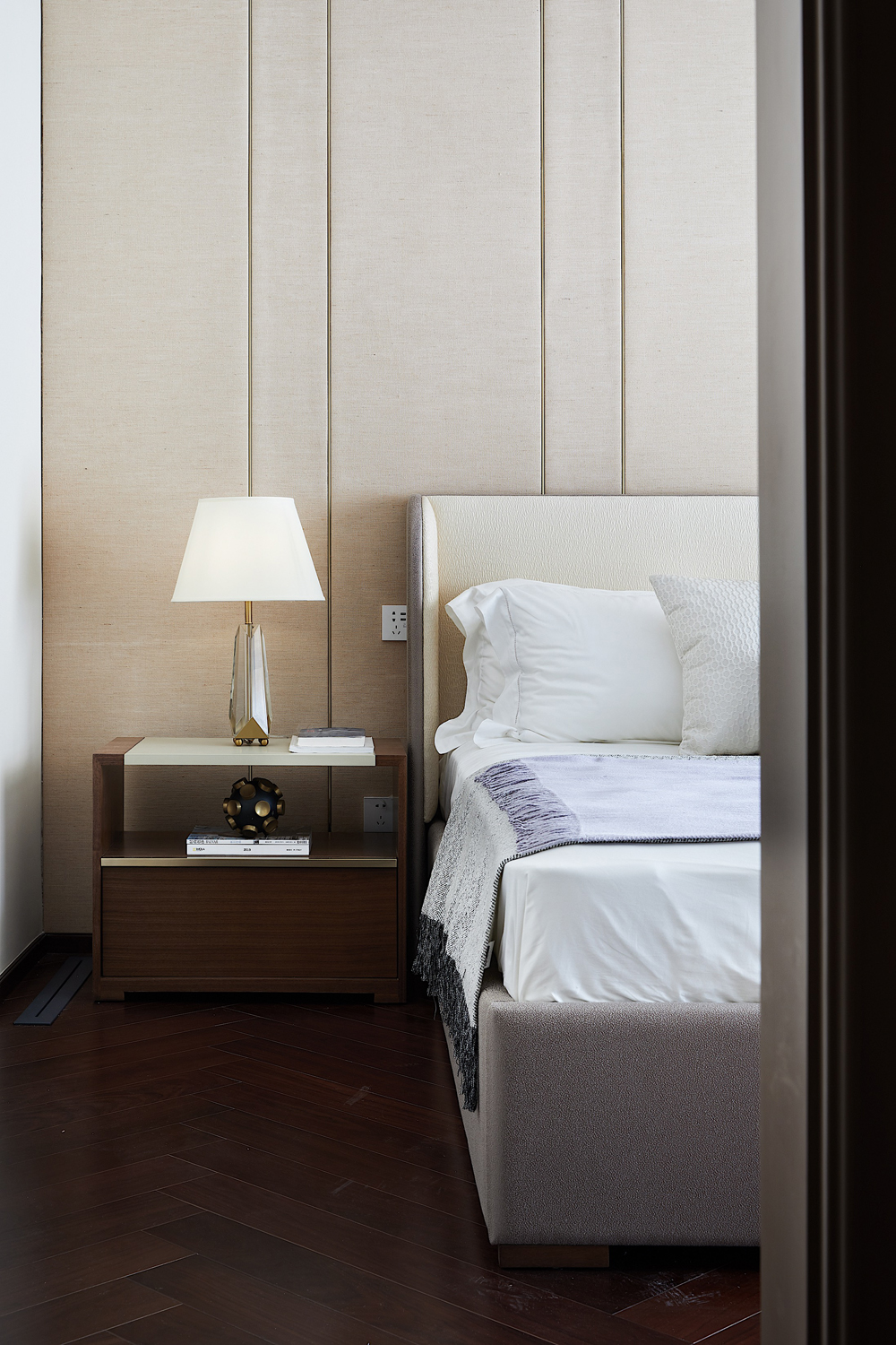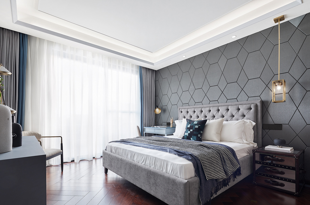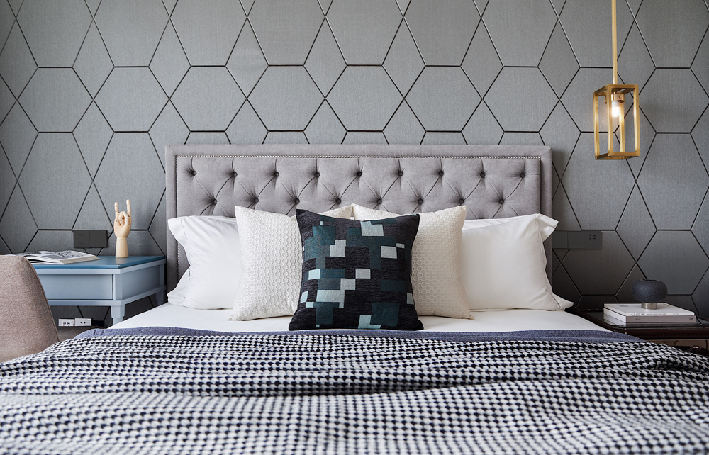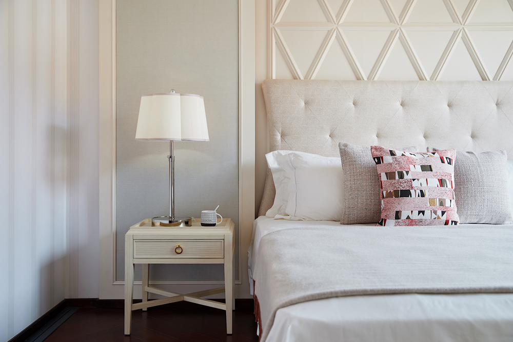 床頭以輕柔的軟包打造,趣味多元的幾何線條勾勒出個性的視覺張力,令空間在低飽和度的色彩中跳脫出輕靈的節(jié)奏感,生活與藝術(shù)在此靜謐融合。