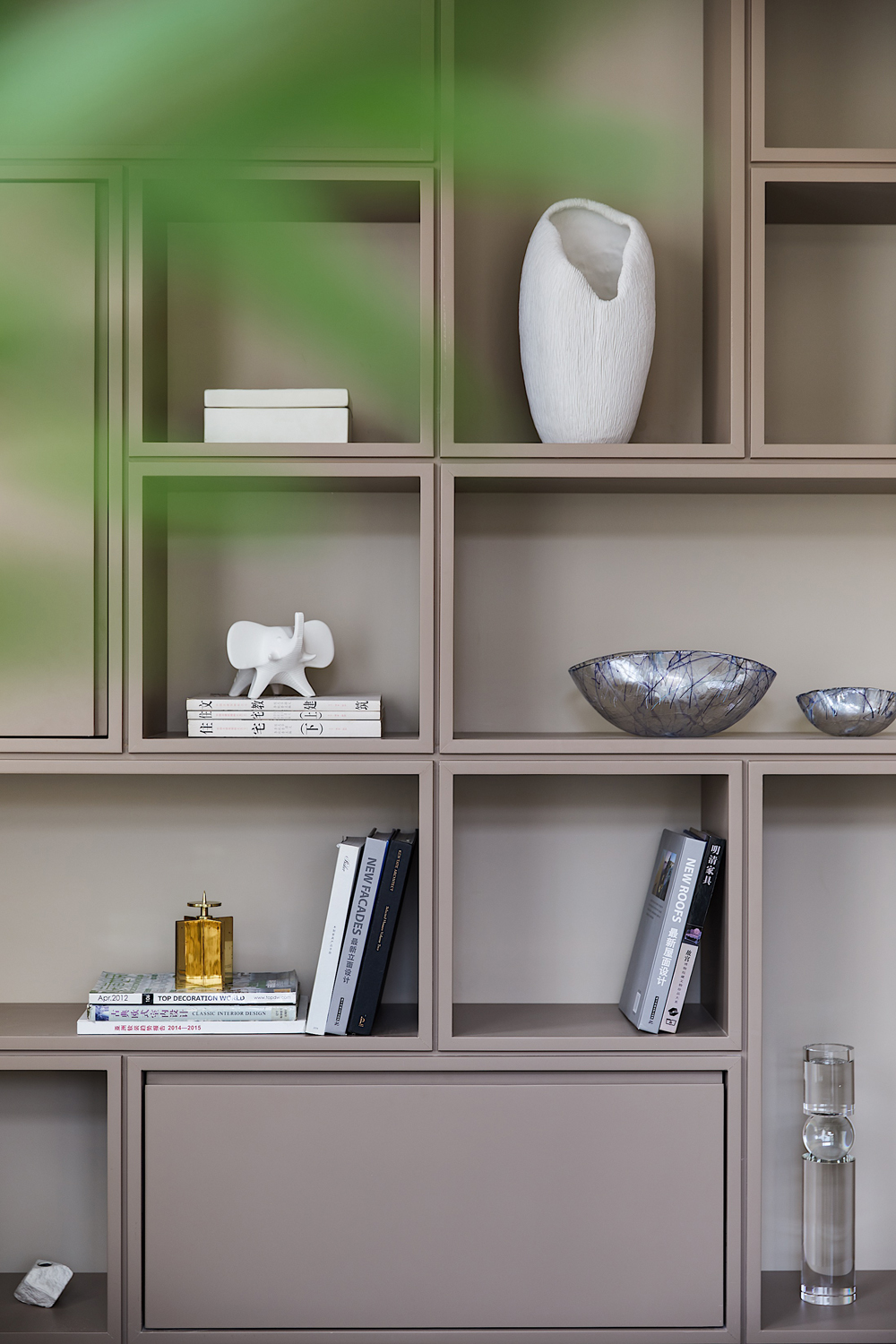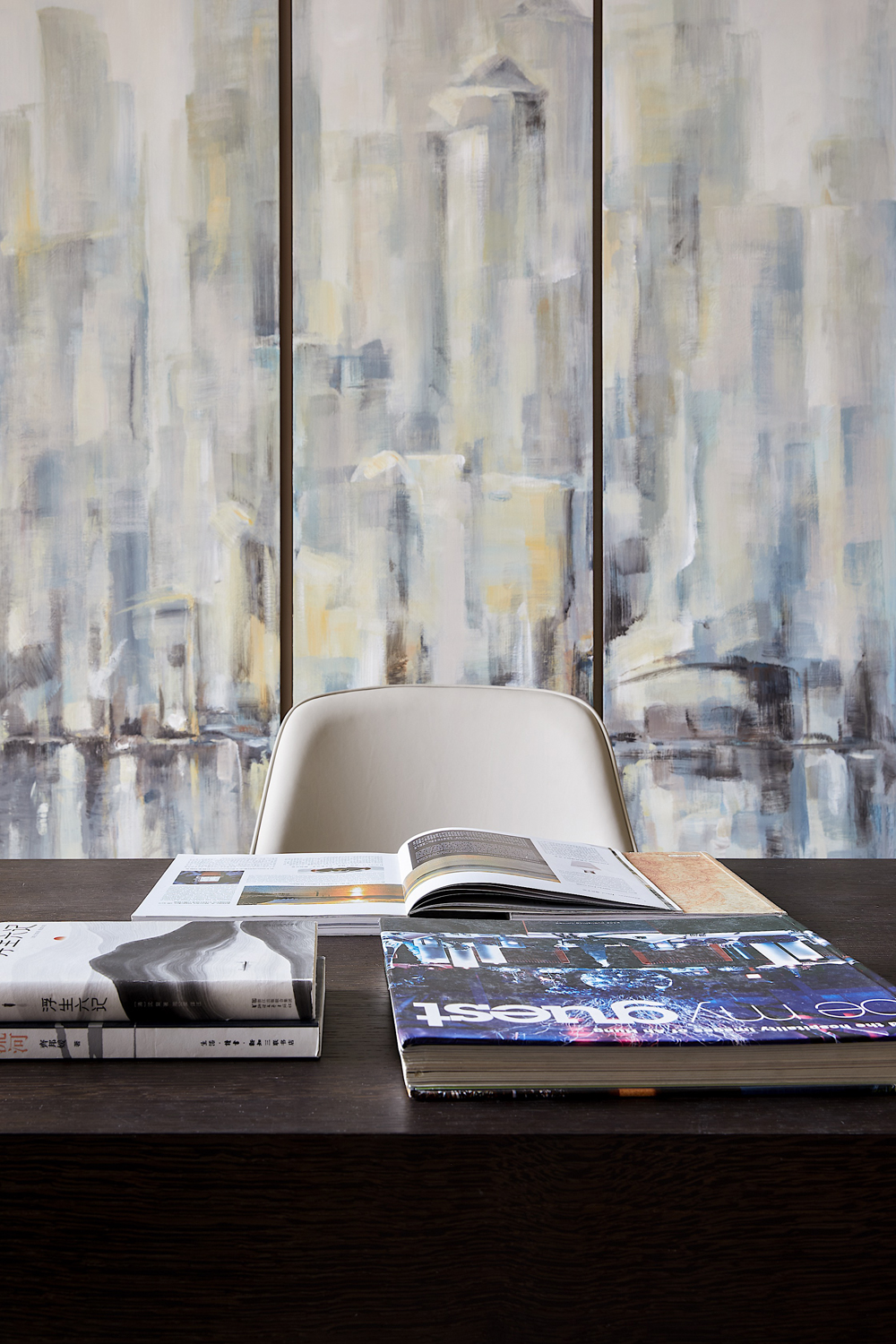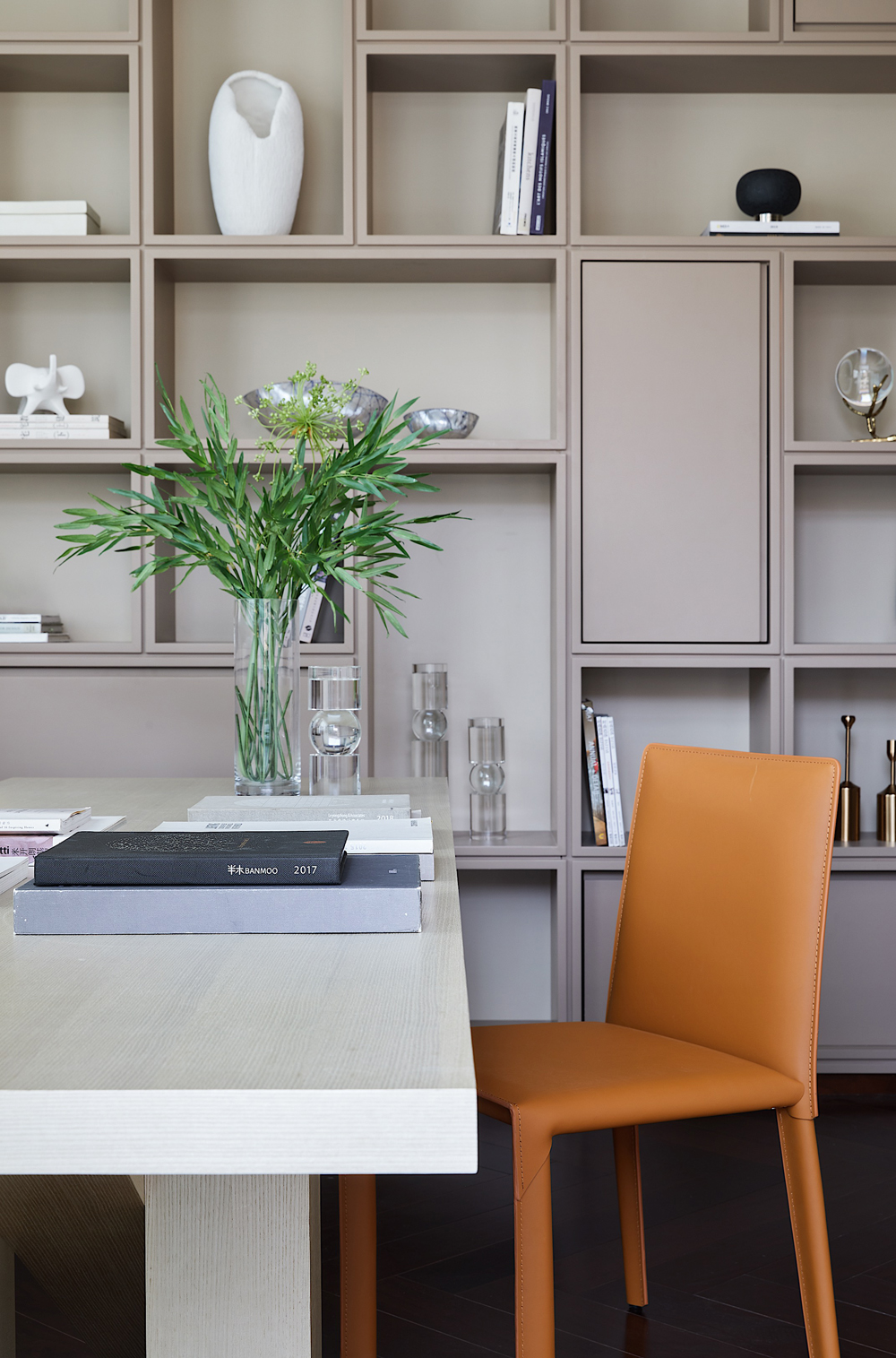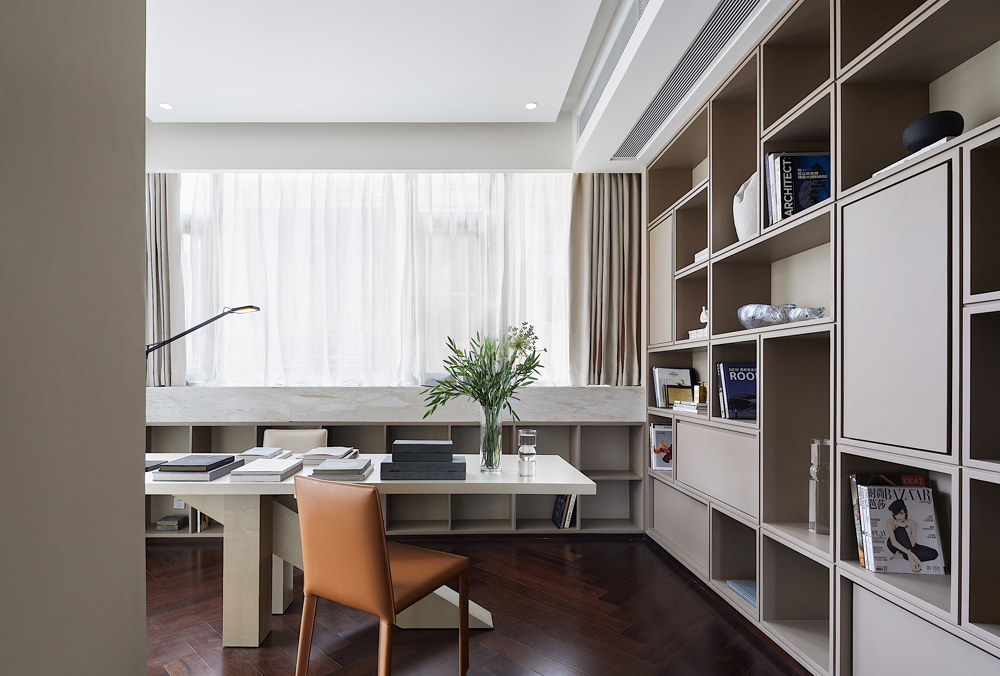 書房位于主臥套房中,空間井然有序,頂天立地式書櫥陳列著居者的藝術(shù)藏品,身后柜門上抽象手繪畫更是將溫厚的人文氣質(zhì)刻畫得淋漓盡致,書中錦繡三千,任居者肆意揮灑。