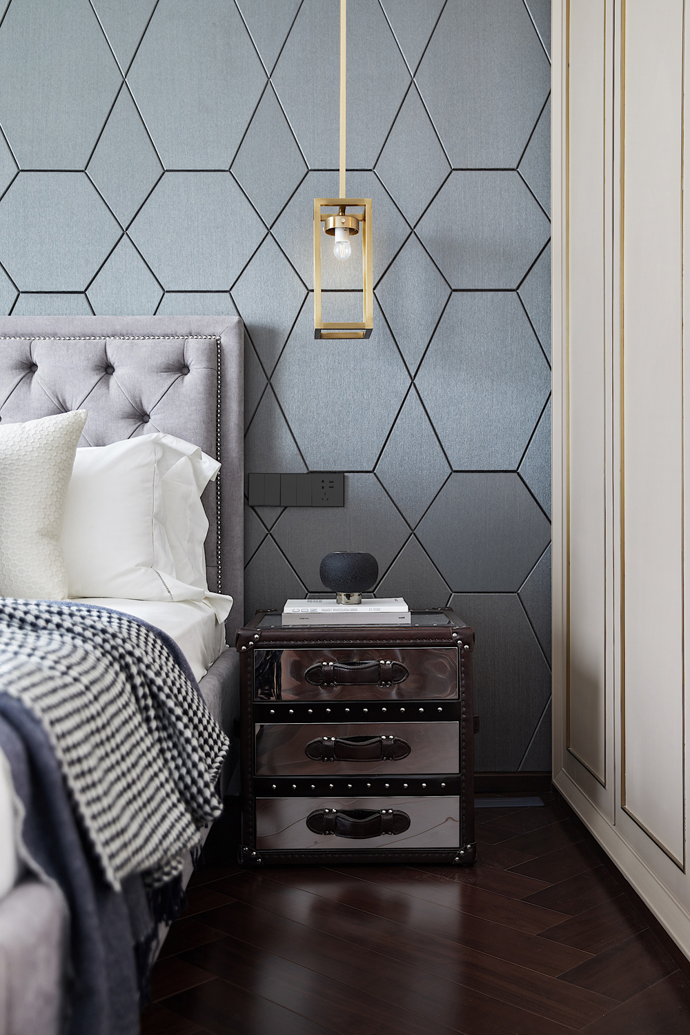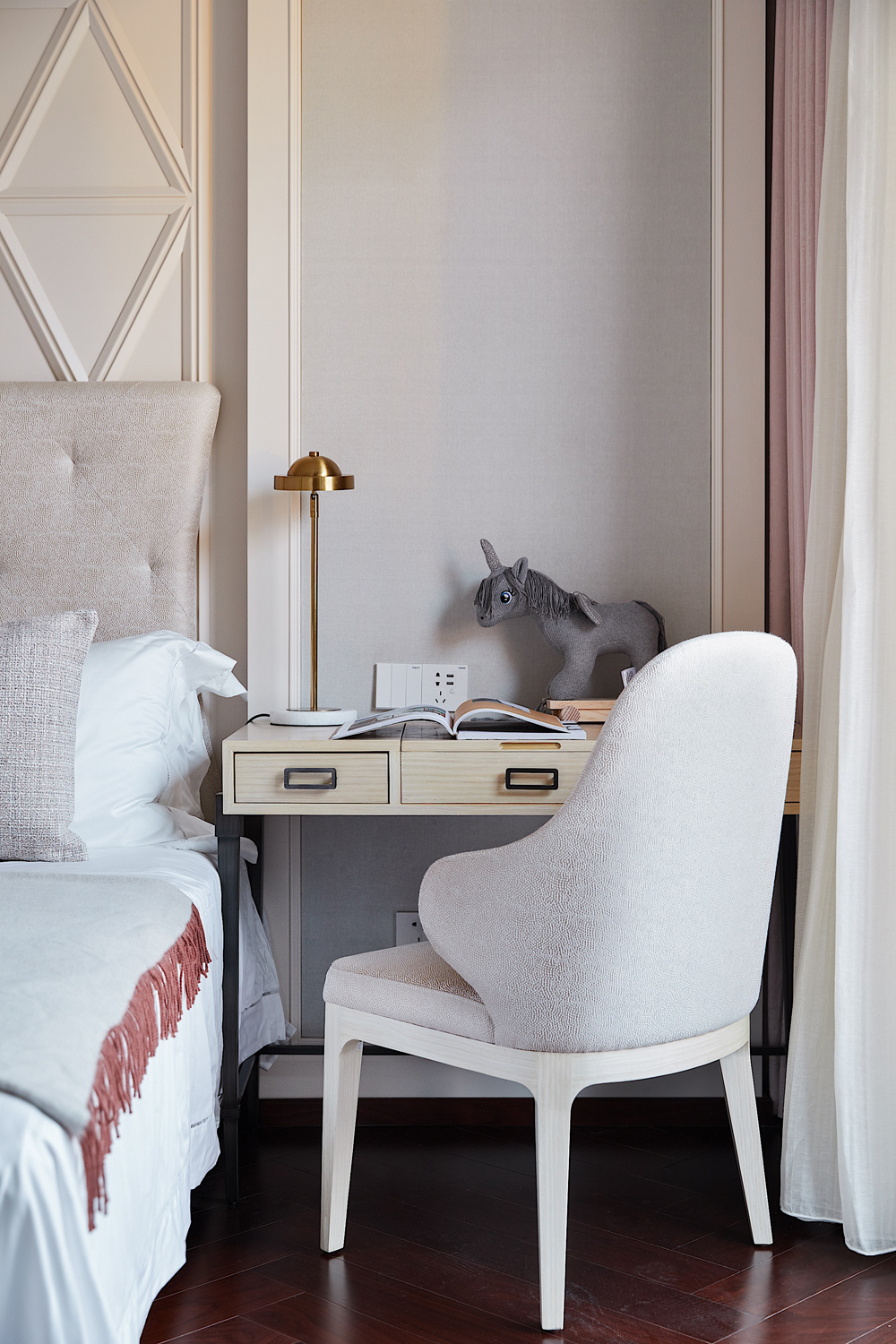 男孩房床頭背景是經(jīng)過變幻后的蜂巢概念,規(guī)整的幾何排布益于孩子思維的拓展開發(fā),不同色塊的組合與千鳥格的搭配,是一種潛移默化的美學(xué)投射,孩子自由成長不受限。