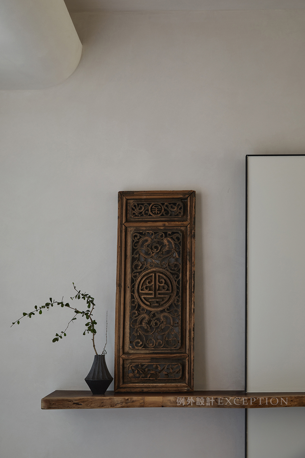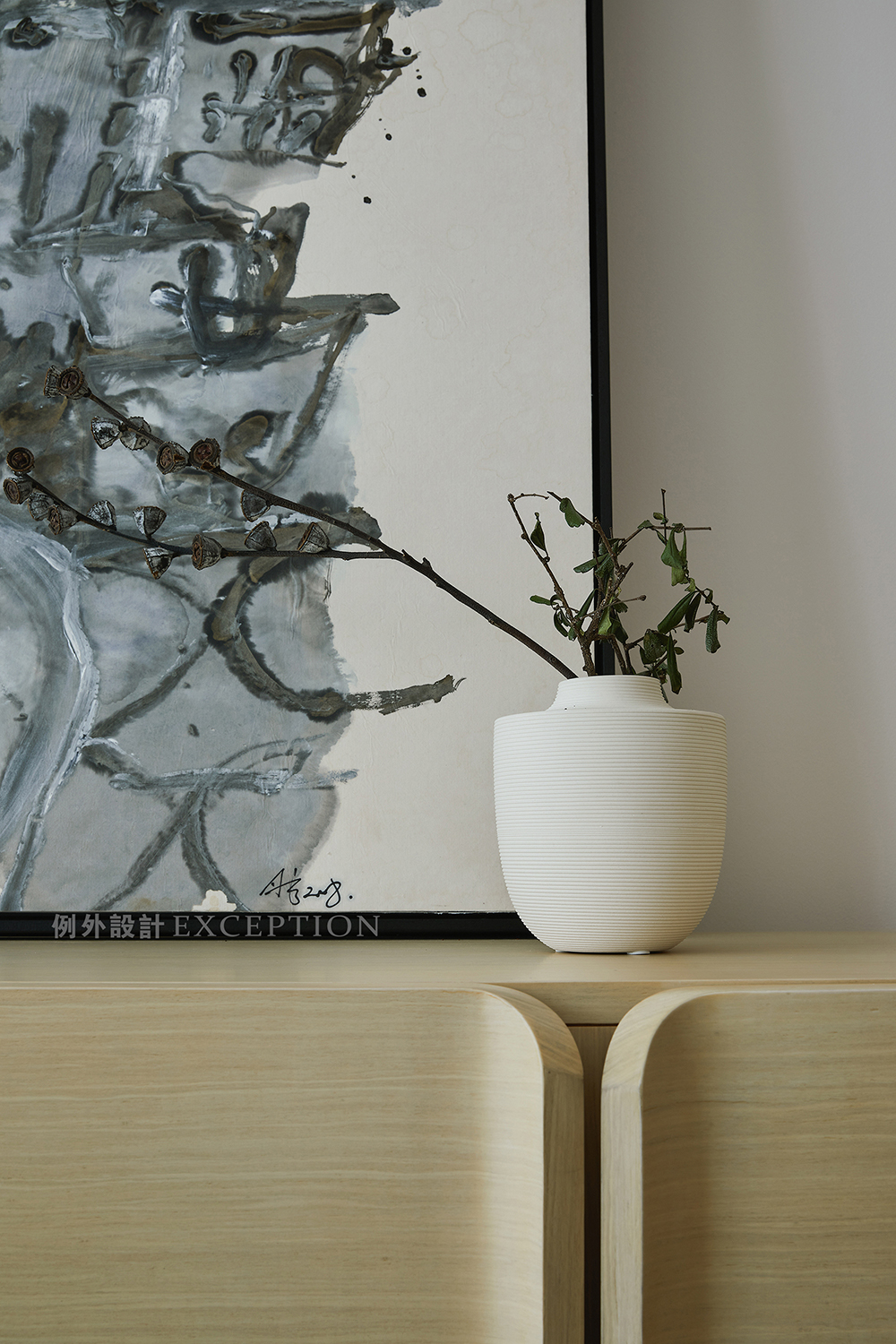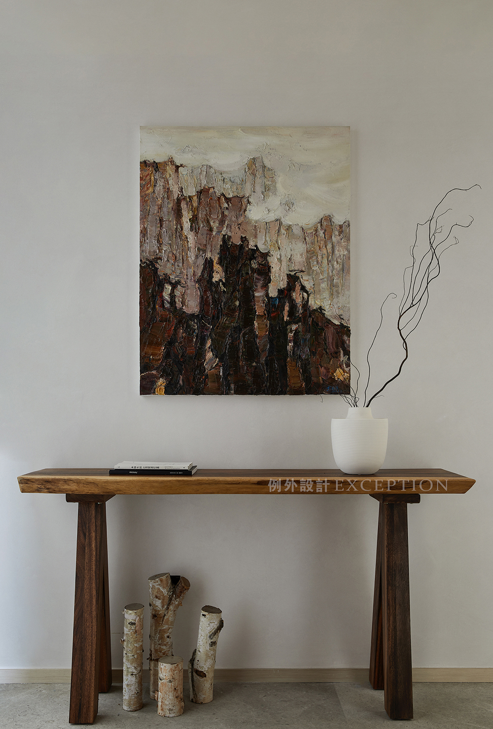 空間是生活情致的延續(xù),也是存放美好回憶的容器。推開(kāi)家門(mén),友人相贈(zèng)的畫(huà)作,瓷瓶枯枝曼妙,身披長(zhǎng)白山風(fēng)雪而來(lái)的木飾,配搭和諧,一縷時(shí)光沉淀的古樸況味,細(xì)膩綿長(zhǎng),謐靜心寧。