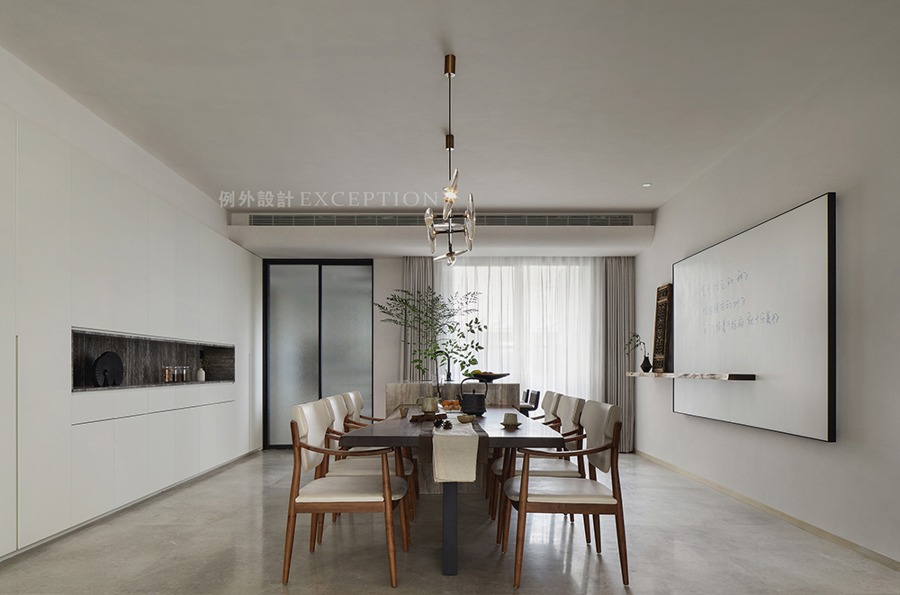 在美學(xué)與實(shí)用之間拿捏設(shè)計(jì)的尺度,是既追求精神花園的閑庭信步,又不失生活煙火的真實(shí)從容。設(shè)計(jì)以簡(jiǎn)約起筆,不規(guī)則線(xiàn)條勾勒靈動(dòng)視感,考慮到家人的使用場(chǎng)景,以智能投影取代傳統(tǒng)電視墻,賦予起居的舒適之美。