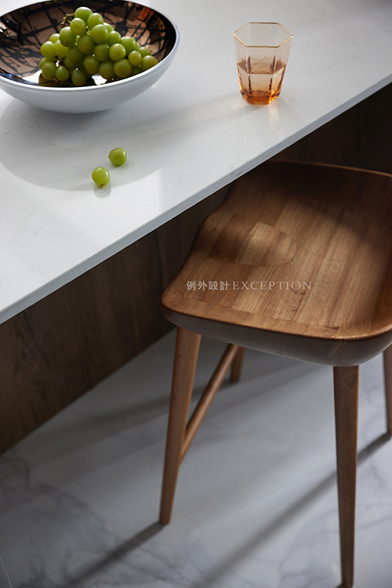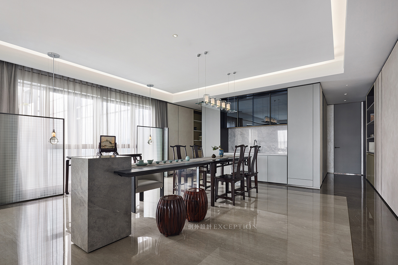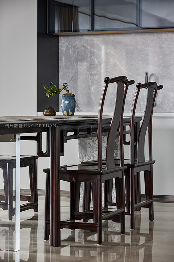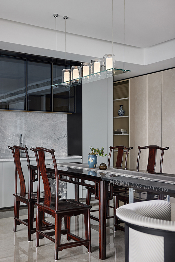 提到文化的傳承,在現(xiàn)代生活語境下,更多的表現(xiàn)為傳統(tǒng)與當(dāng)代邊界的消弭、和解與重組。餐廳的設(shè)計(jì)凸顯了屋主對傳統(tǒng)家具的欣賞,定制大理石茶臺與已有的餐桌組合,豐盈了空間的 層次與氣質(zhì),無論餐饗或品茗,都是氣定神閑的從容與自如。