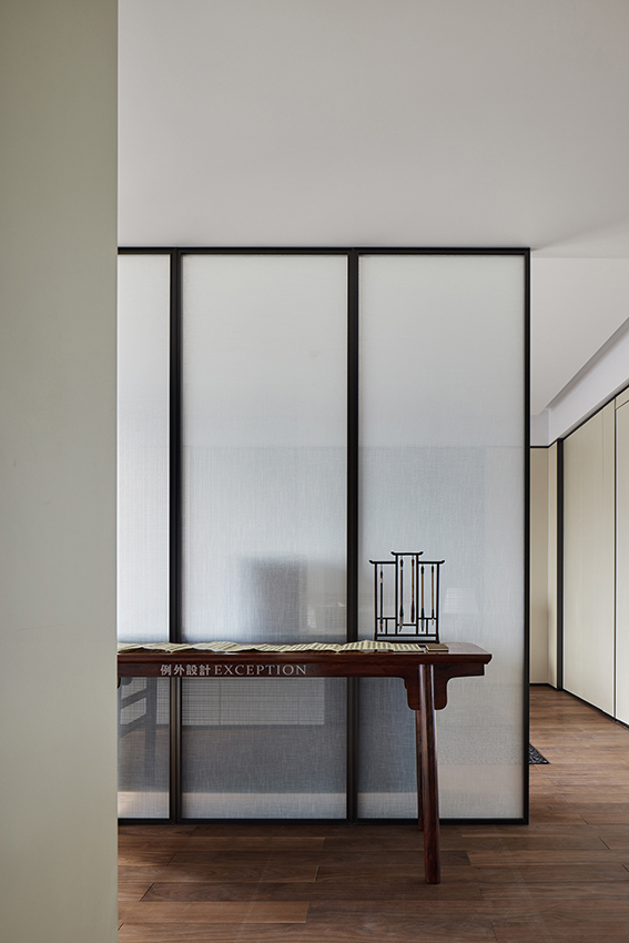 主臥套房以半通透屏風(fēng)開啟歲月靜好的休憩畫面,空間錯(cuò)落有致。設(shè)計(jì)將原有的兩房打通,屏風(fēng)前是男業(yè)主的私人天地,安靜辦公、潑墨揮毫、研究家具歷史,每一天都內(nèi)心豐盈而曠達(dá)。