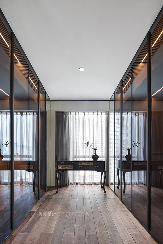 衣帽間是彰顯女主人氣度風(fēng)華的所在,對稱而列的衣櫥足夠容納春夏秋冬的美學(xué)靈感,在專屬的私人空間表達(dá)對于生活日常的熱愛與理解。