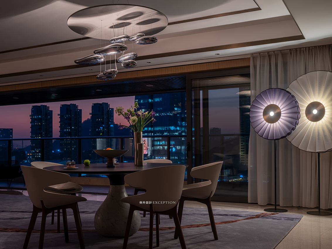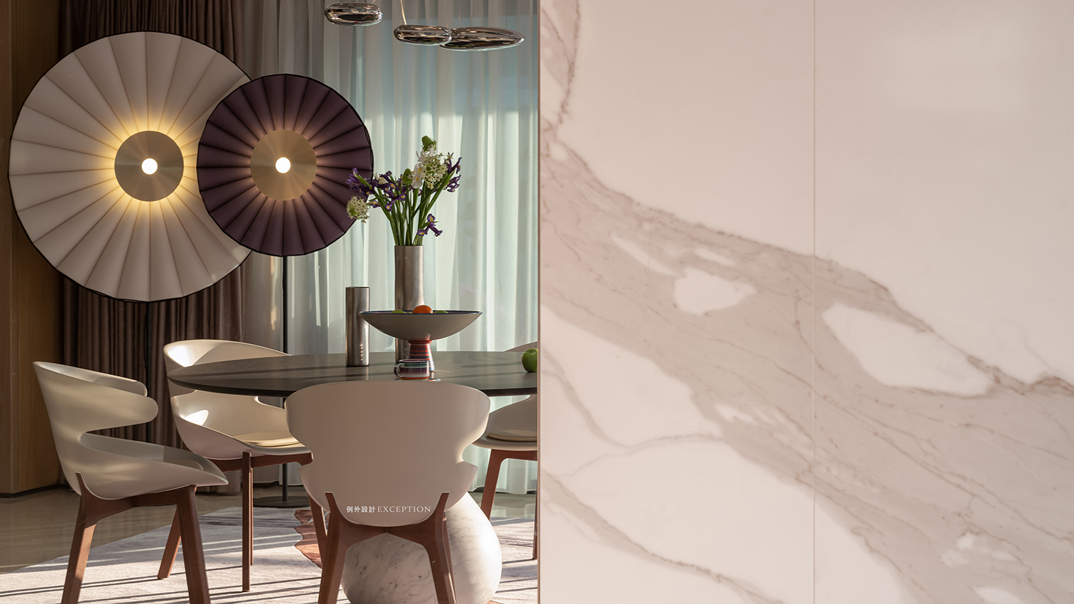 空間是有溫度和氣質(zhì)的,如同旅途的風(fēng)景,需要你親自抵達,細細領(lǐng)會。reine紫色太陽花落地?zé)粼诓蛷d一角營造出柔和的光影,紫色的花枝被陽光輕撫,在銀色游魚燈影下悠閑搖曳,六人位餐桌期待著川湘魯粵的各色風(fēng)味,食物的香氣縈繞鼻尖,芳香因子在井然有序的空間里得到最大化釋放,正如設(shè)計師徐靜所說:幸福往往就藏在這平常的煙火氣里。
