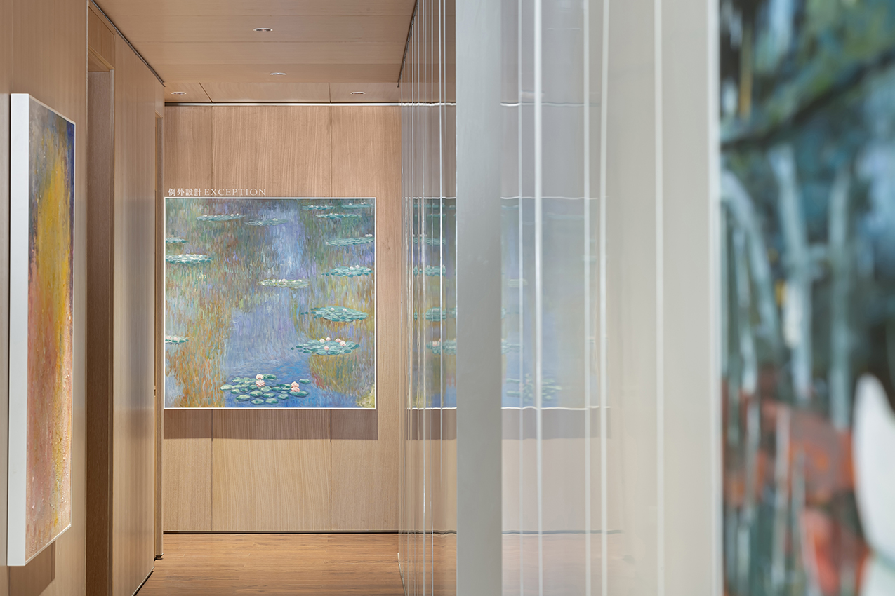 莫奈的睡蓮在廊道盡頭瀲滟著波光,多伊格的白色獨木舟在離奇怪誕的風(fēng)景中天馬行空。原木色沉淀出空間的延伸與張力,于藝術(shù)與生活之間探尋深層的感知奇遇,過廊片刻的停留,便能收獲一份小確幸。