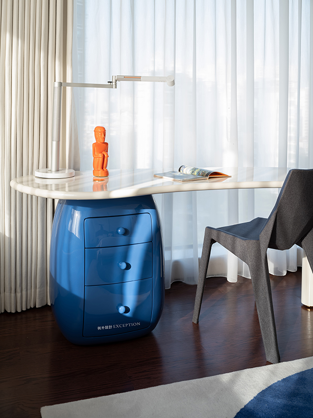 推開門,清風(fēng)和陽光悄悄溜進來,不同層次的藍色在光影中融合、交疊,有大海的深邃,亦或是天空的晴朗,編織成一派自然隨性的清爽。建筑體塊構(gòu)成的寶藍色造型書桌,以合適的角度容納雙人辦公、小孩互動的場景??词澜绲慕嵌葘α?, 哪里都是風(fēng)景。