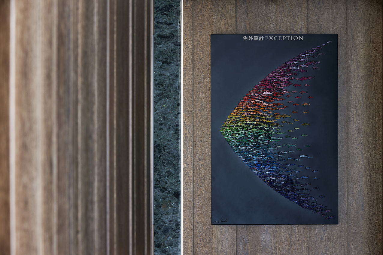 玄關(guān)盡頭是藝術(shù)家 Joel Amit 的藝術(shù)掛畫,由成百只魚的造型游弋成一只全新的七彩魚,高低錯落,頗為生動明艷,作為整個空間的視覺焦點,躍動著如魚得水的美好寓意。