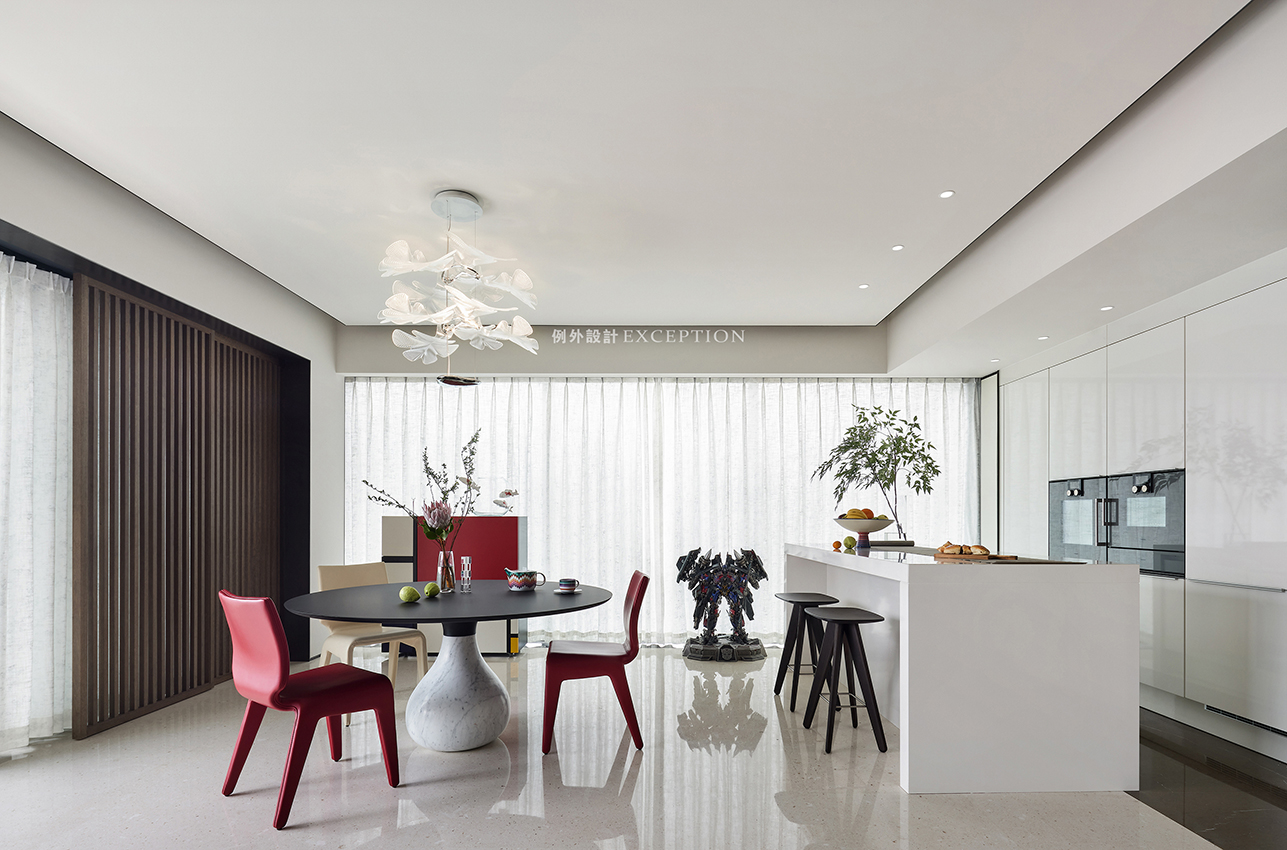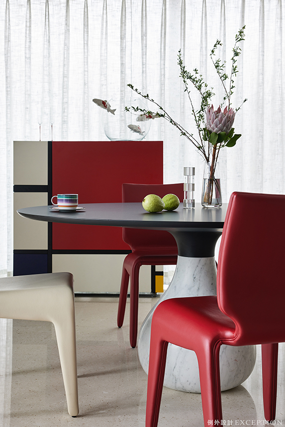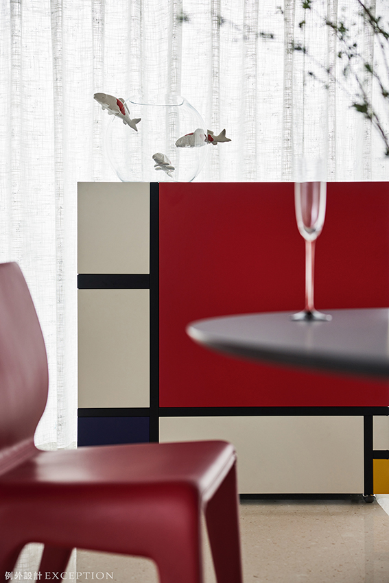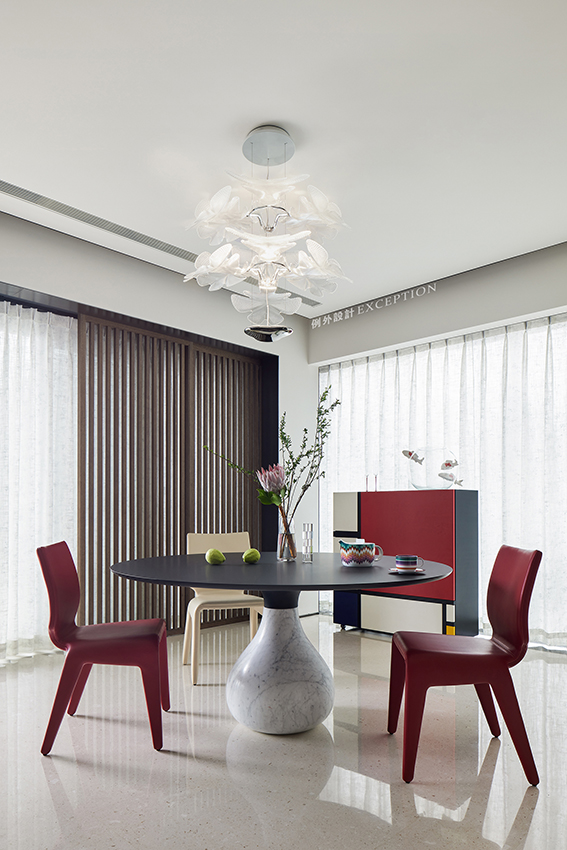 蒙德里安經(jīng)典的紅黃藍(lán)白元素融入餐邊柜的創(chuàng)意中,成為餐廳一隅的經(jīng)典。紅白相配的皮質(zhì)餐椅圍合黑白拼接的水滴形餐桌,豐富了家人三餐四時的藝術(shù)享受。雅白花朵吊燈更是將這一氛圍烘托得更加濃郁、澄澈。格柵屏風(fēng)朦朧中透露詩意,空間強(qiáng)烈的色彩所調(diào)和的韻律感,成為讓人深情迷戀的所在。