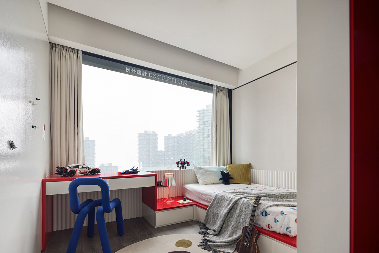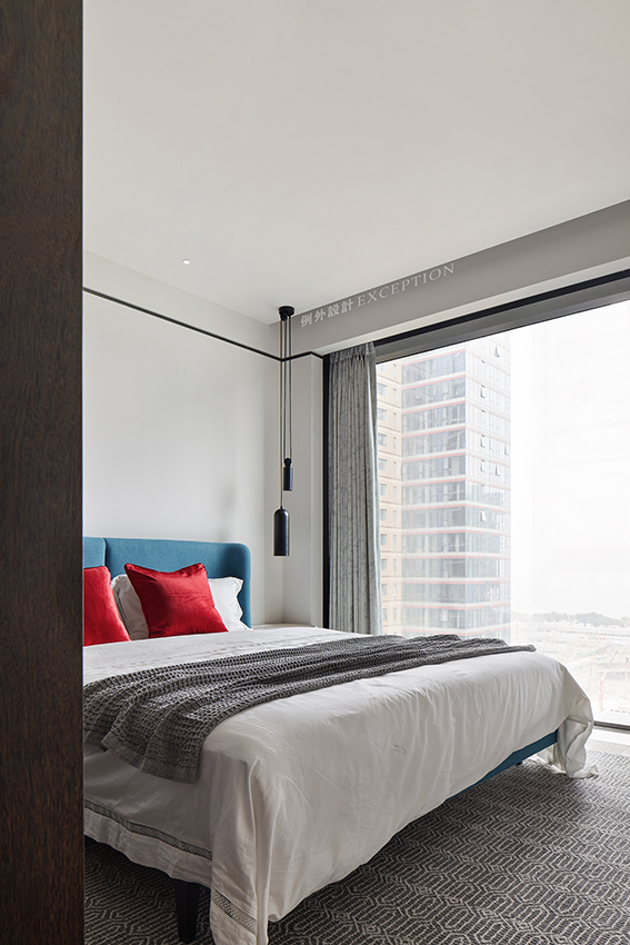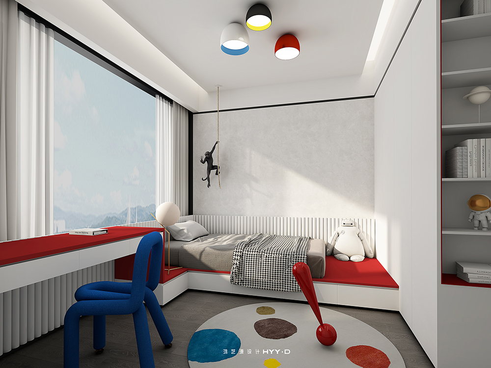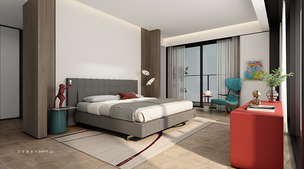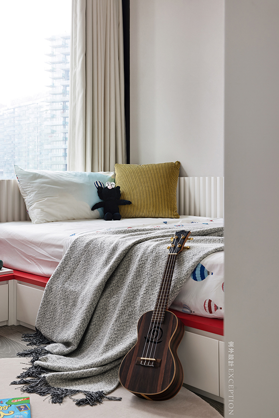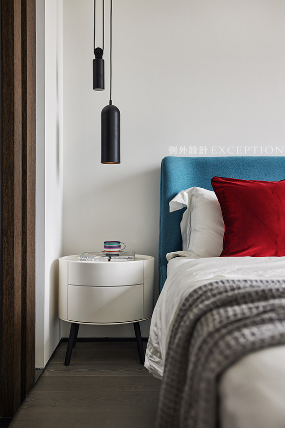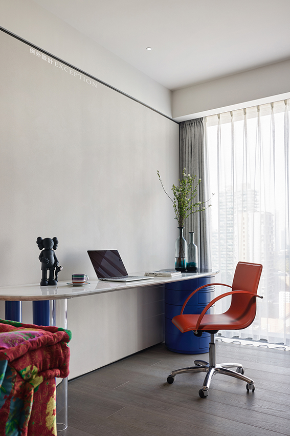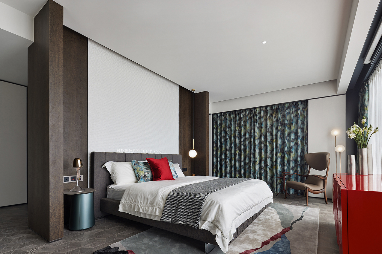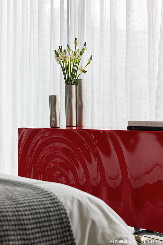 主臥延續(xù)玄關(guān)空間的藝術(shù)線索,床頭墻面白色群魚自在暢游,紅色裝飾柜一圈泛起的漣漪將思緒拉進(jìn)自然的呼吸中,再次強(qiáng)化了如魚得水的靈感設(shè)想。作為一個私享的休息空間,一部會心的電影,一次深入的暢談,生活的浪漫情調(diào)都會生發(fā)于此,余韻悠長。