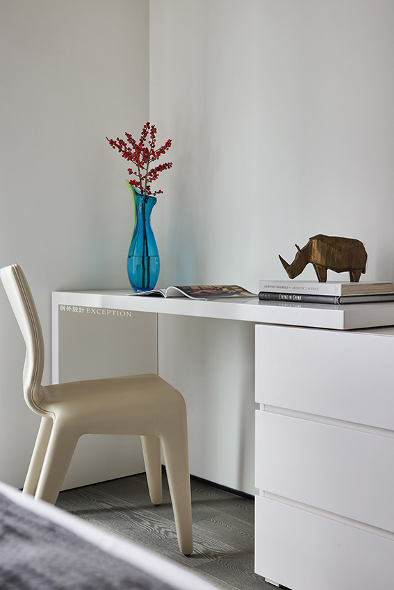 長輩房去繁就簡,通過米白的家具和床品營造干凈純粹的清韻。祥和喜樂的紅色搭配雅致的藍(lán)色,加上小巧的飾品,寥寥數(shù)筆就勾勒出藝術(shù)而不失生活氣息的空間氛圍。
