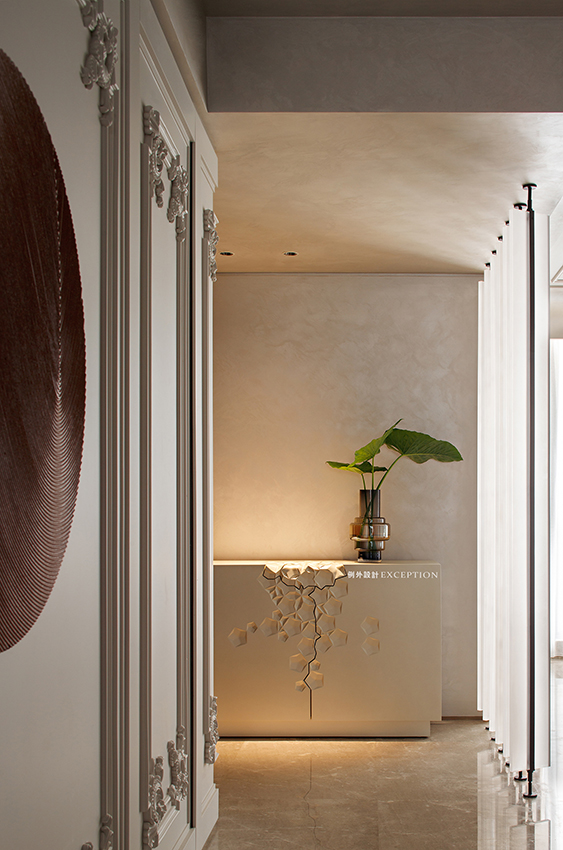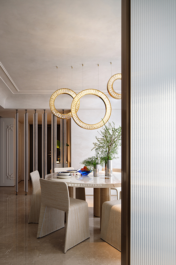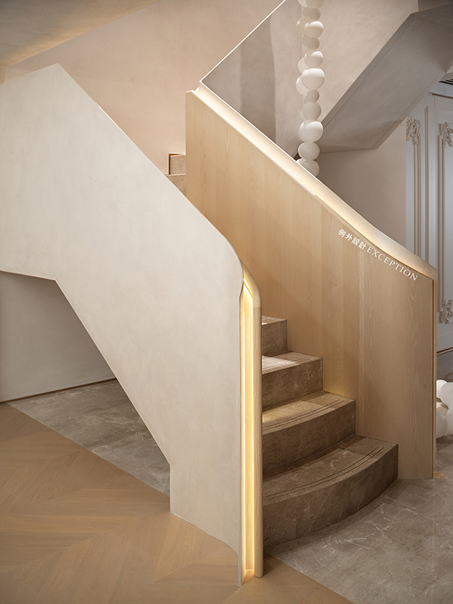 隨著視線的上移,白色串珠裝飾如同珍珠項(xiàng)鏈指引著新的空間視角,承啟上下空間的優(yōu)雅敘事。
