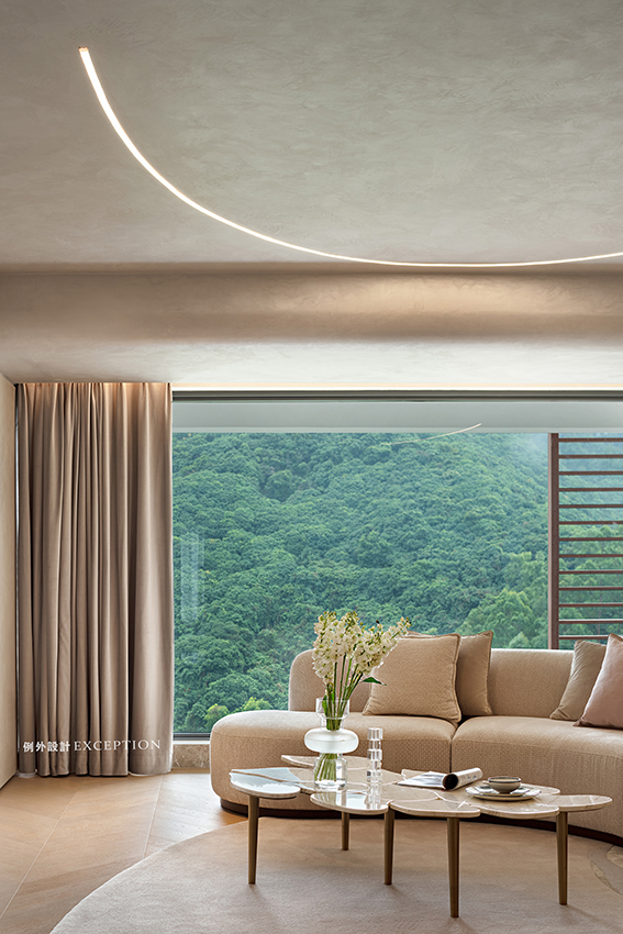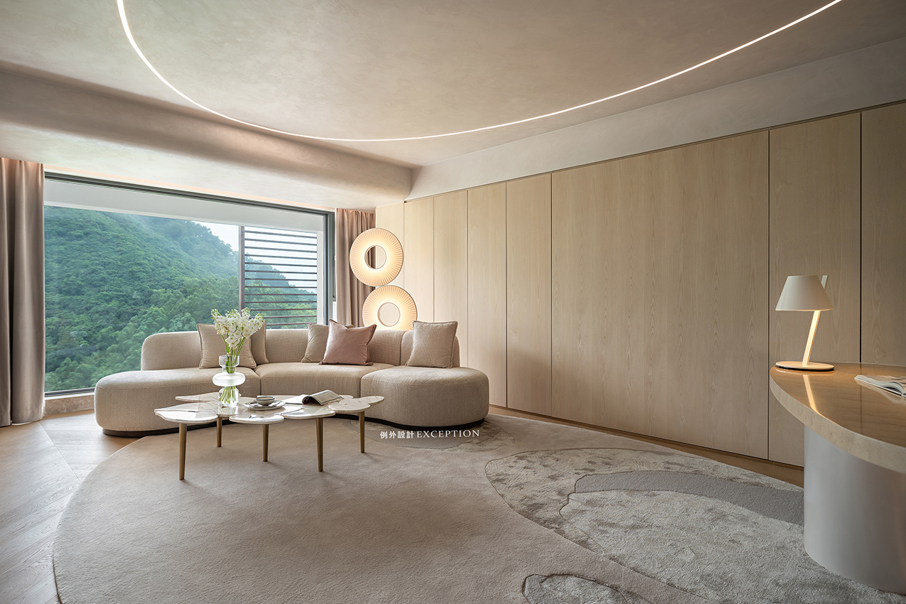 多功能廳結(jié)合了書房和客房的功能,暗藏式下翻床與收納柜完美融合,木飾面與生俱來的溫暖氛圍會讓人更加放松。落地窗將自然山景框進(jìn)室內(nèi),憑窗遙望,清風(fēng)似乎吹來了山野的濕潤空氣,讓人心甘情愿陷入了這一場盛大的綠。無需過多設(shè)計語言,當(dāng)光線在室內(nèi)流動,休閑或閱讀的場景就是一幅輕靈靜美的畫,瞬間獲得治愈的力量。