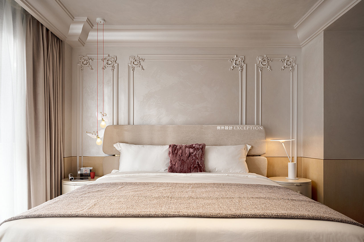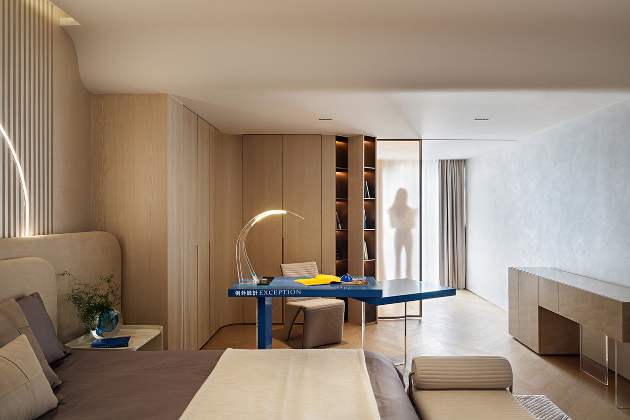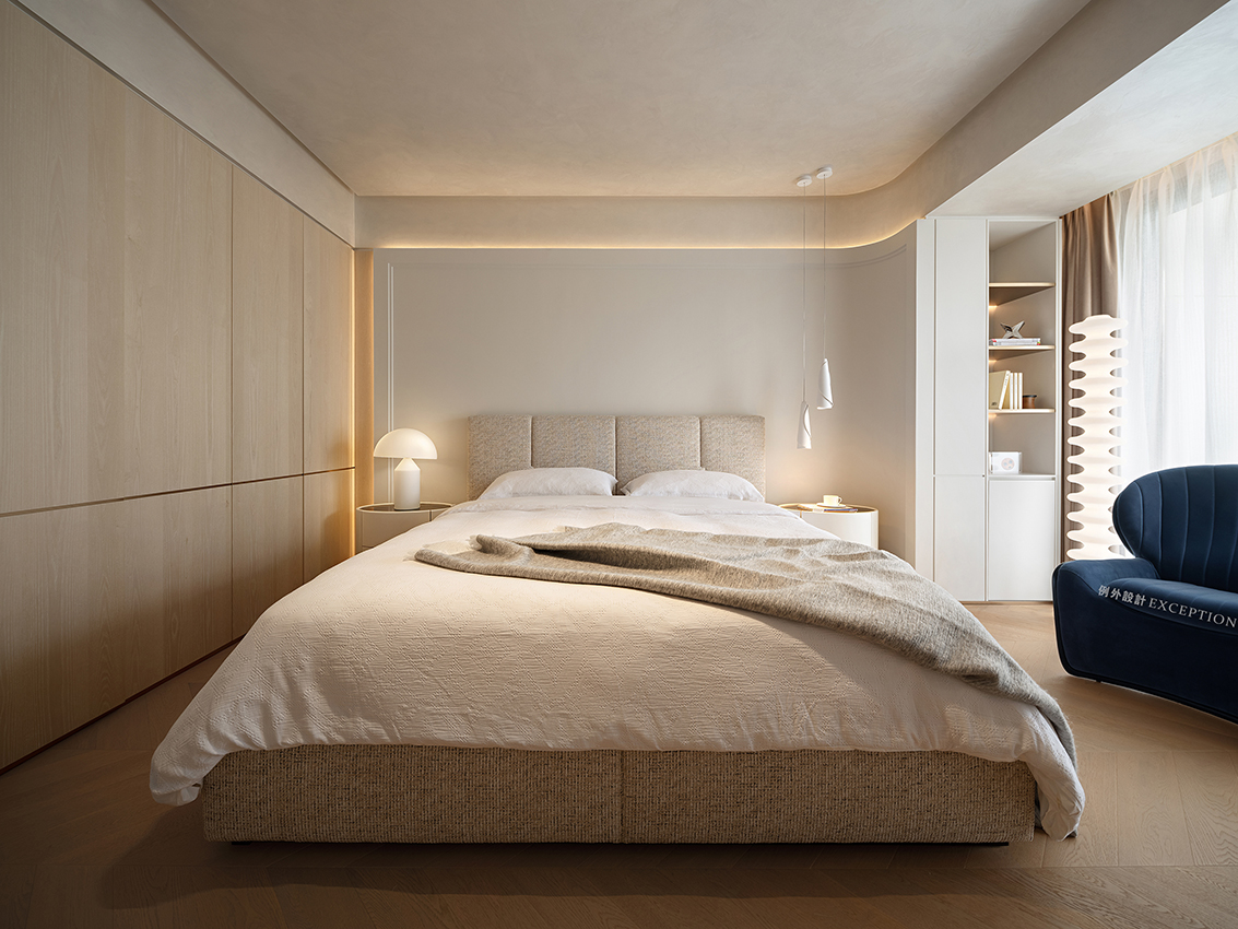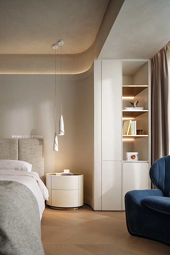 女主人的臥室依舊延續(xù)整體優(yōu)雅富有包容性的奶油色,每一處細(xì)節(jié)不爭不搶,陽臺納入室內(nèi)增加了舒適的尺度,線條和體塊的相遇,各自美麗卻又彼此契合。墻背后特意設(shè)計了暗藏的步入式衣帽間,梳妝區(qū)以不一樣的視角納入恰到好處的光線,映照出居者專屬的氣質(zhì)和品位。