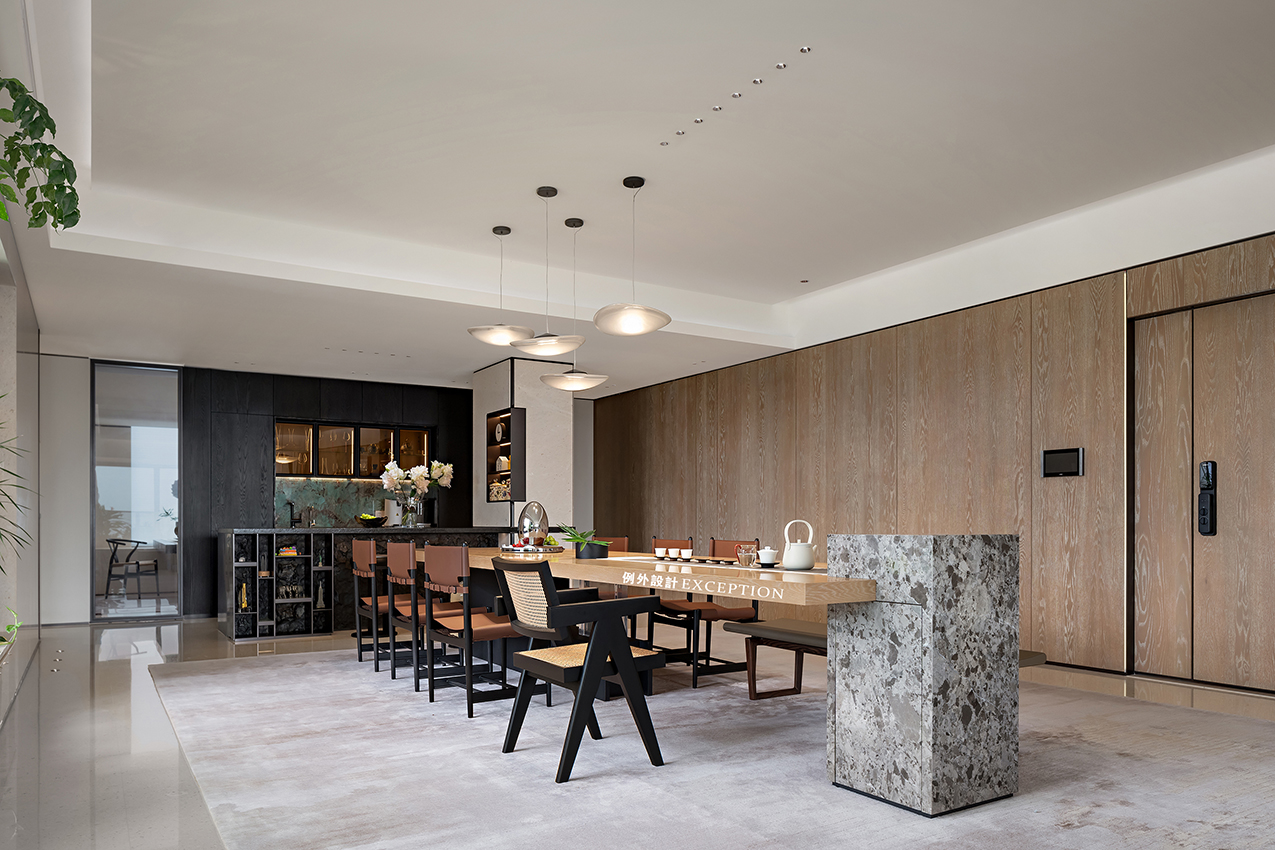 客餐廳一體打通,形成視覺上的延伸感,家人的生活動(dòng)線也更加清晰、流暢。餐桌加茶臺(tái)的組合設(shè)計(jì)使餐廳功能得到了延伸,家人就餐以及日常社交都可以在此進(jìn)行。面向盈盈綠意,心境也會(huì)更加開闊、明朗。