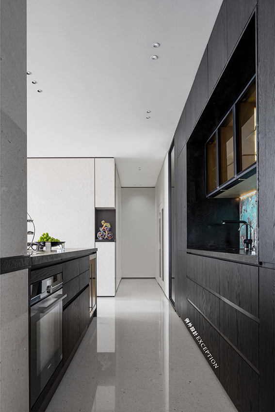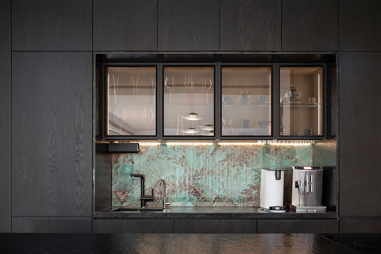 除了烤箱、水吧等必備的搭配,西廚還配備了咖啡機(jī)和恒溫酒柜,滿足了屋主每天來杯手沖的松弛時(shí)光。意興正酣的時(shí)候,夫妻倆也可以小酌一杯,漫數(shù)生活里的細(xì)碎日常。