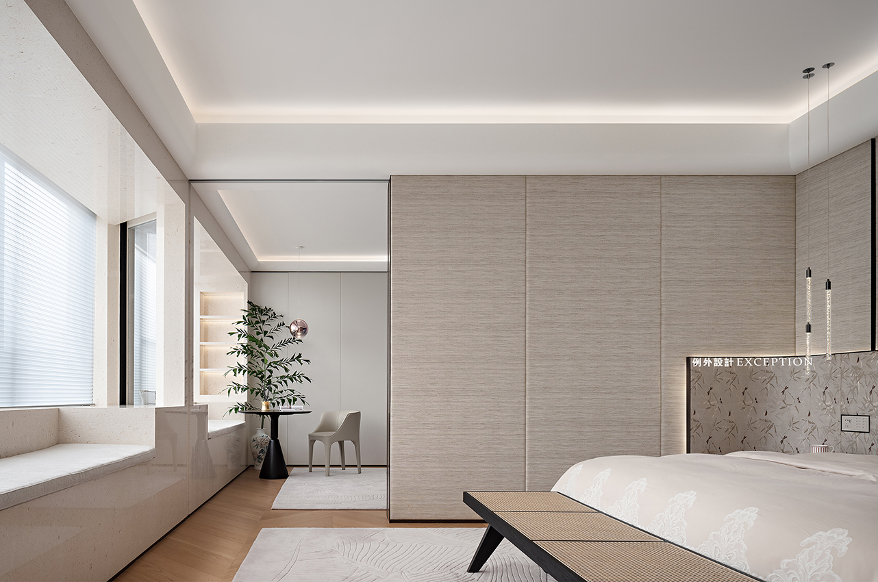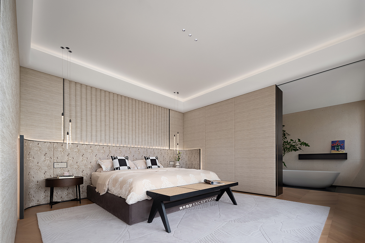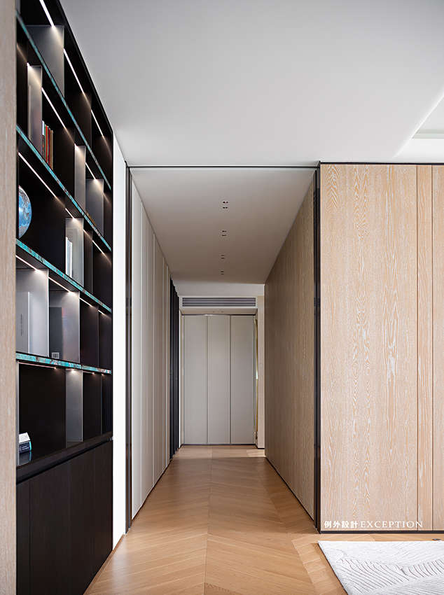 主臥三進(jìn)式的布局增加了生活的儀式感,考慮到男女屋主不同的起居時(shí)間,主臥、書房、衣帽間及主衛(wèi)之間通過推拉門產(chǎn)生鏈接,即使男屋主應(yīng)酬晚歸時(shí),也不會(huì)影響愛人的睡眠。另外多動(dòng)線的設(shè)計(jì)讓屋主在衣帽間穿搭完畢后,無需返回主臥,便可快速出門。