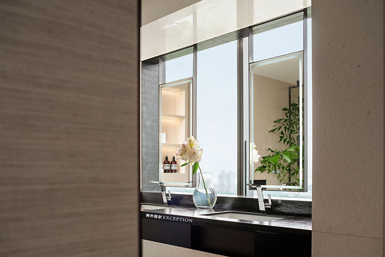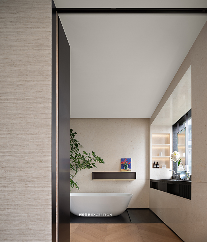 主衛(wèi)的視覺感非常輕盈,金屬邊框勾勒出極簡(jiǎn)舒適的感覺,壁龕上的花朵小畫是屬于屋主的生活藝術(shù),來點(diǎn)音樂,在沐浴精油的香氣中,讓一天的疲憊緩緩散去。