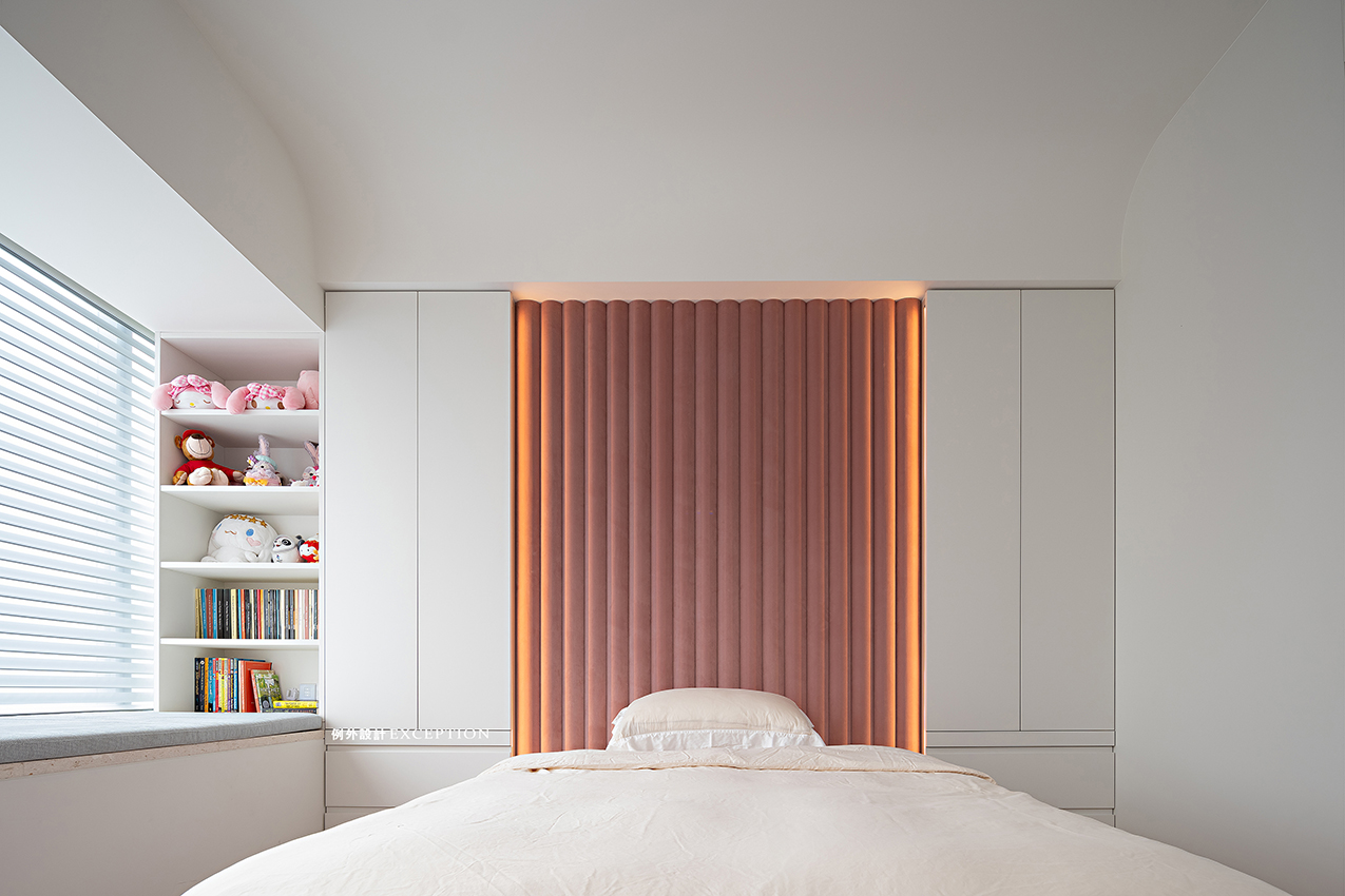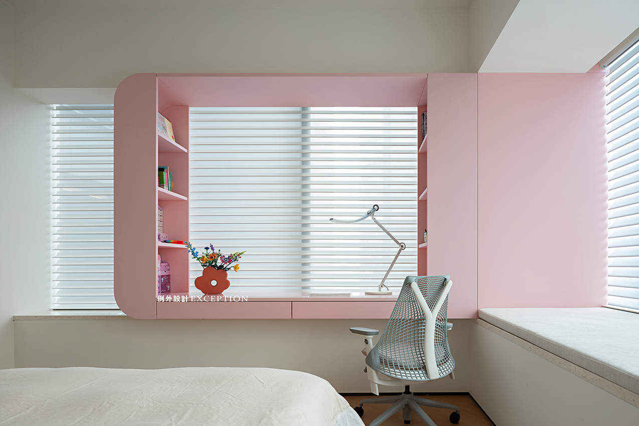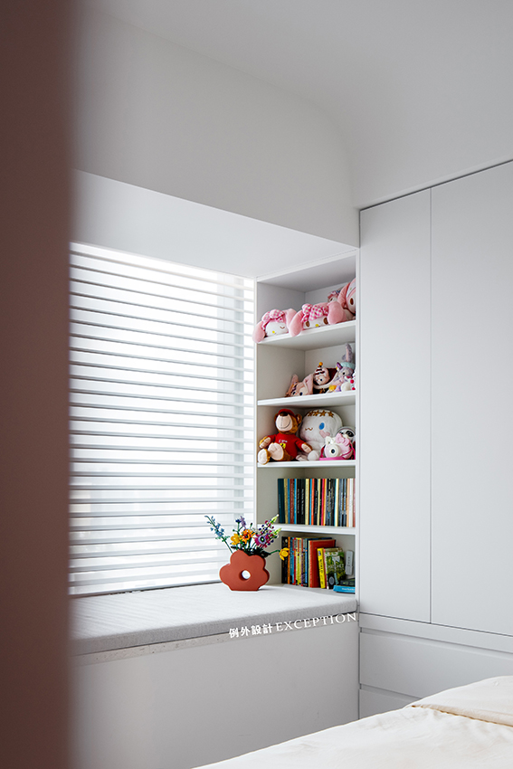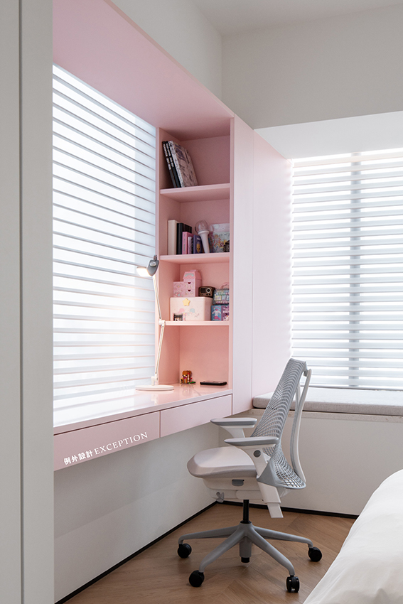 將飄窗空間作為孩子學(xué)習(xí)看書的小天地,讓有限的空間被利用到極致。隨處可見的收納設(shè)計(jì)讓空間整潔有序,粉白的配色柔化了生活的棱角,讓女孩的成長(zhǎng)滿目陽光和詩意。