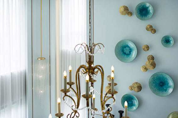 “要增加空間的美學(xué)氛圍,除了將自然引入室內(nèi),還可以通過藝術(shù)品的陳設(shè)來逐一實現(xiàn),從而賦予獨特的精神內(nèi)涵?!逼┤缈蛷d悄然綻放的藍(lán)色花朵,在薄紗和日光的映襯下,都在試圖將優(yōu)雅詮釋得更加具象化。