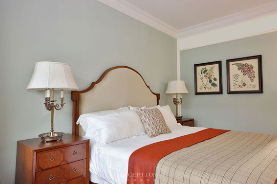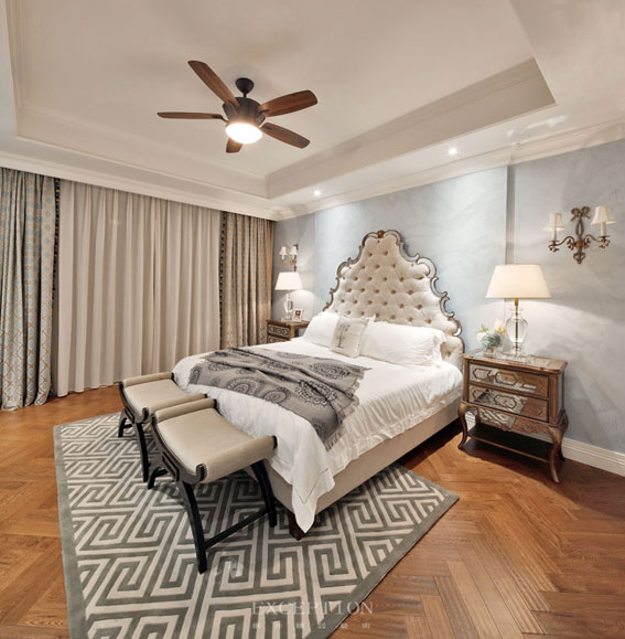 向歷史尋根溯源,幾百年前自歐洲遷徙而來的不只是勇于探索開拓的人民,還有建筑上的美學文化,美式風格移植了歐羅巴的奢侈與貴氣,在幾百年后的今天,被設計師傳承融匯出這一室的浪漫。依然以大地色系為主導,米色絲光絨、優(yōu)質棉麻搭毯、素雅冷靜的白色床品交織成一個舒適靜謐的休憩空間,別出心裁的鏡面裝飾折射出主人對雅致時尚生活的品味。