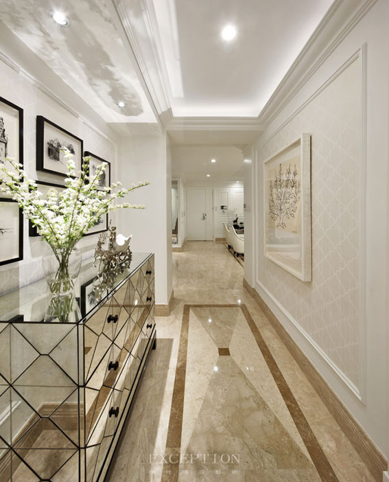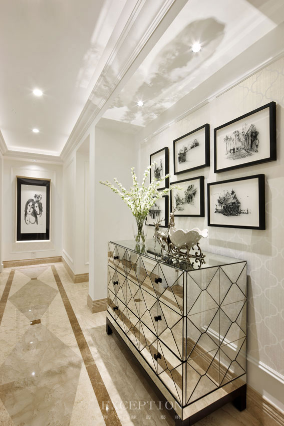 玄關(guān)只為一個空間的過渡,此處以仿雪花白大理石加玻璃鏡面體現(xiàn)效果,讓人忍不住流連與回顧。最喜墻面的簡潔的裝飾畫,形成不可或缺的道道風景。
