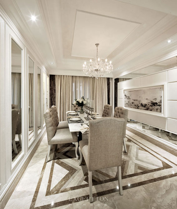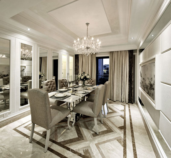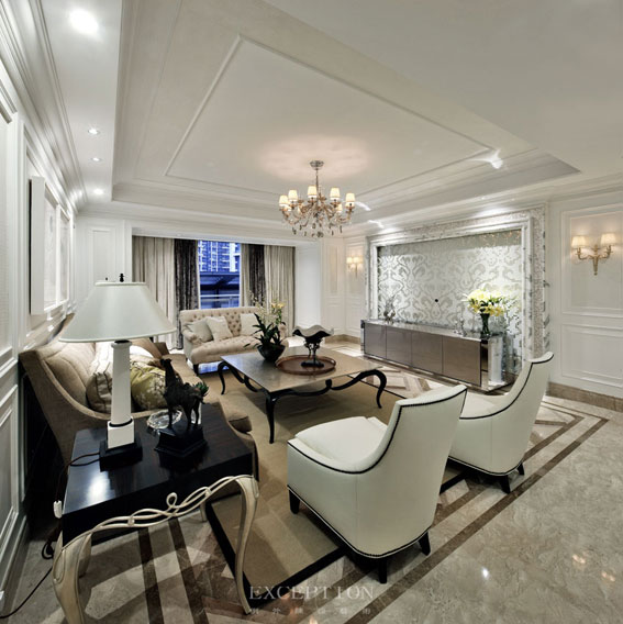 設計師以簡歐風格為主調(diào),配合后現(xiàn)代主義美式家私的新古典元素,拋棄多余繁冗的堆砌裝飾,極力還原一個簡白亮麗的純色空間,米色加白色以及少量黑灰色彰顯極簡主義的凌厲果敢與美學韻致,大量使用仿雪花白白大理石、玻璃馬賽克、白色仿皮革質(zhì)感的涂料等偏現(xiàn)代裝飾材質(zhì),符合時下現(xiàn)代人的審美視覺,目及手觸之處都是玲瓏一片純玉白。