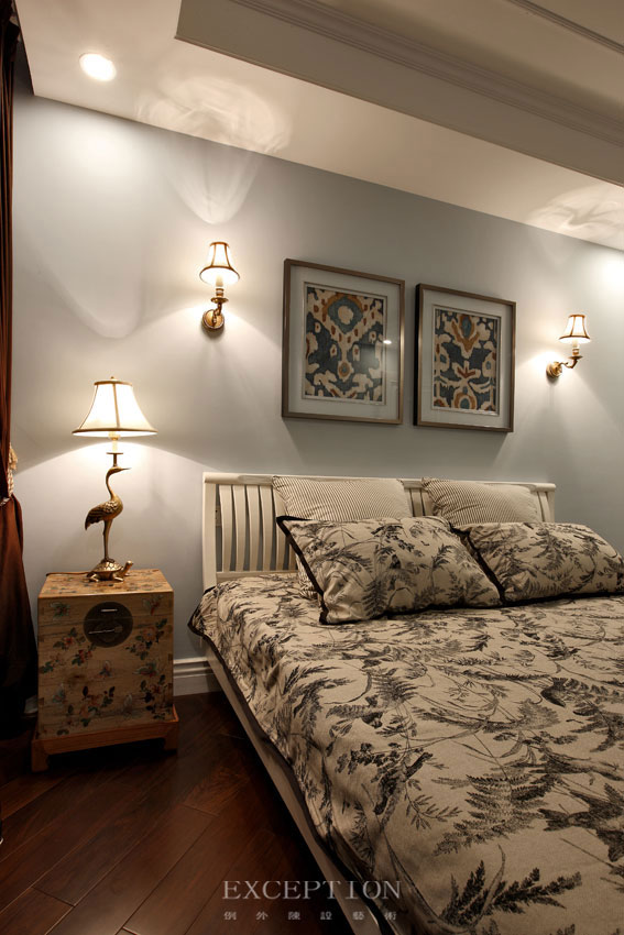一片梨白的淡雅框定出印花墻紙的深沉格調(diào),灰藍色的花紋與孔雀壁畫一同,驕傲的炫耀著專屬它的雅致。
