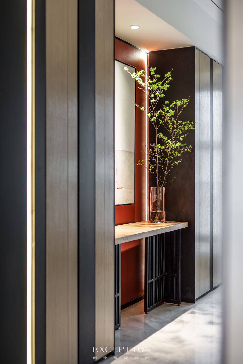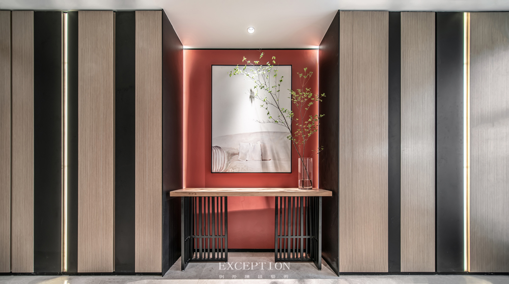 項(xiàng)目位于深圳寶安中心,坐收面海觀城的無(wú)邊美景,其兩梯一戶(hù)、四室兩廳的戶(hù)型設(shè)計(jì),為居住帶來(lái)尊享體驗(yàn)。步入門(mén)廳,端景以正統(tǒng)的朱紅色調(diào)擔(dān)起空間的儀式感,欣欣生長(zhǎng)的枝枒為空間色彩起了緩沖的作用,在光影下顯現(xiàn)出清雅之韻味。