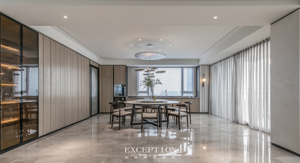 餐廳的燈飾頗有意境,像串聯(lián)一汪汪露珠一樣晶瑩透亮??扇菁{十人的圓桌構(gòu)筑起中式餐食禮儀,朝迎曦光,暮會(huì)煙霞,四時(shí)三餐,家人們可以在這里盡情享受料理與就餐的親昵時(shí)光。