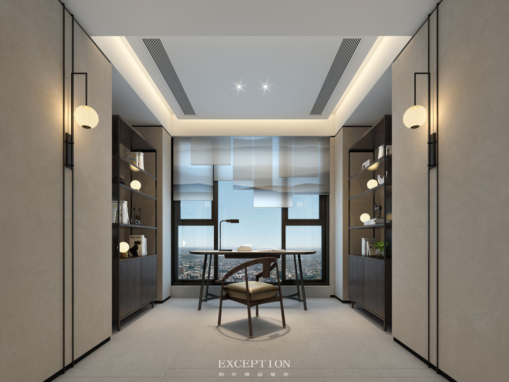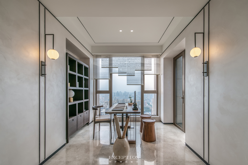 錯(cuò)落層疊的山水掛簾,與窗外繁華城景對(duì)比糅合,仿佛寫(xiě)意出海市蜃樓的朦朧之美。簡(jiǎn)約的中式博古架與盈盈燈飾散發(fā)著簡(jiǎn)美古樸的味道,清風(fēng)入堂作伴,斜陽(yáng)輝光漫灑,設(shè)計(jì)將書(shū)寫(xiě)閱讀的場(chǎng)景搭建出婉約閑逸的意境美。