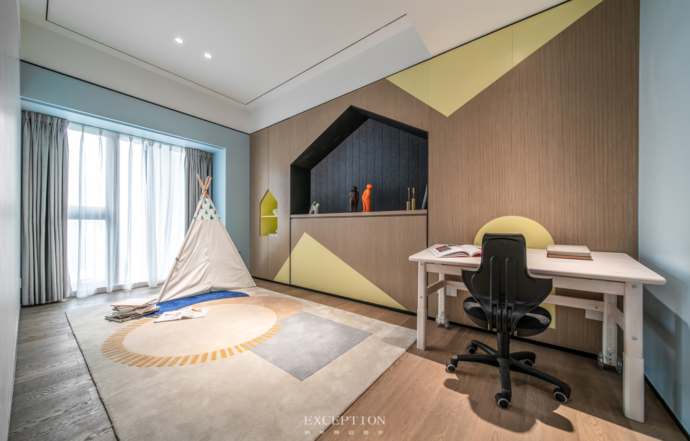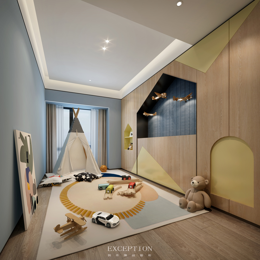 設(shè)計(jì)在主臥對(duì)門(mén)規(guī)劃了一間兒童房,在令孩子擁有自己獨(dú)立空間的同時(shí),父母也能及時(shí)照顧到小朋友的一些需求。日間時(shí)分,孩子可以在寬闊的娛樂(lè)區(qū)里進(jìn)行趣味的游戲玩耍,到了夜間,可以將收納于墻面的折疊床打開(kāi),搖身一變成為專(zhuān)屬的兒童臥室。