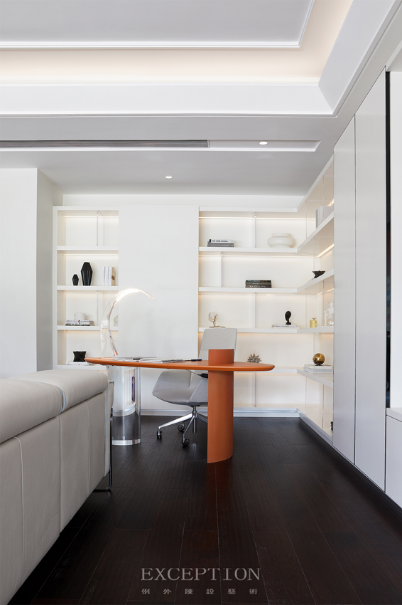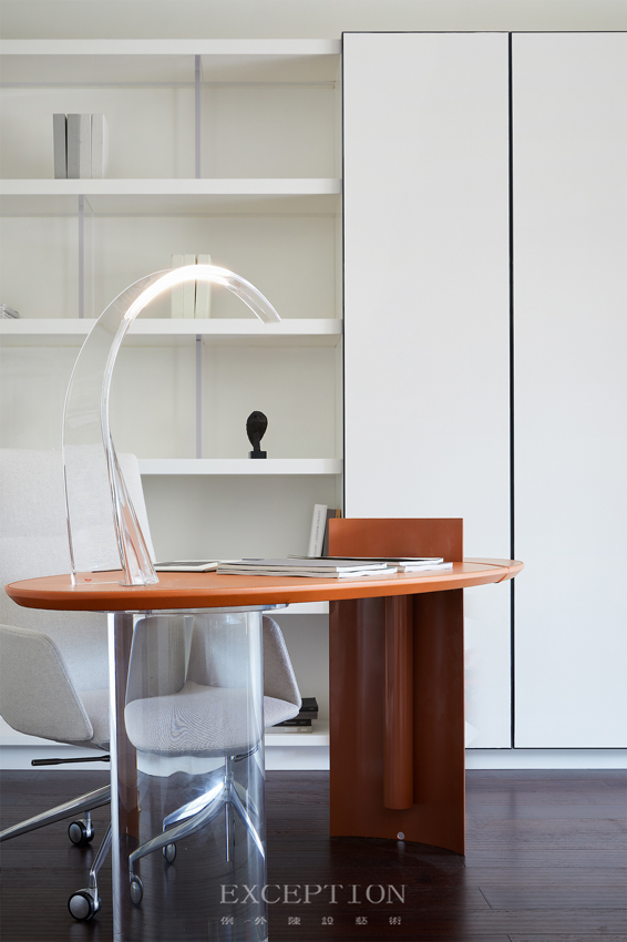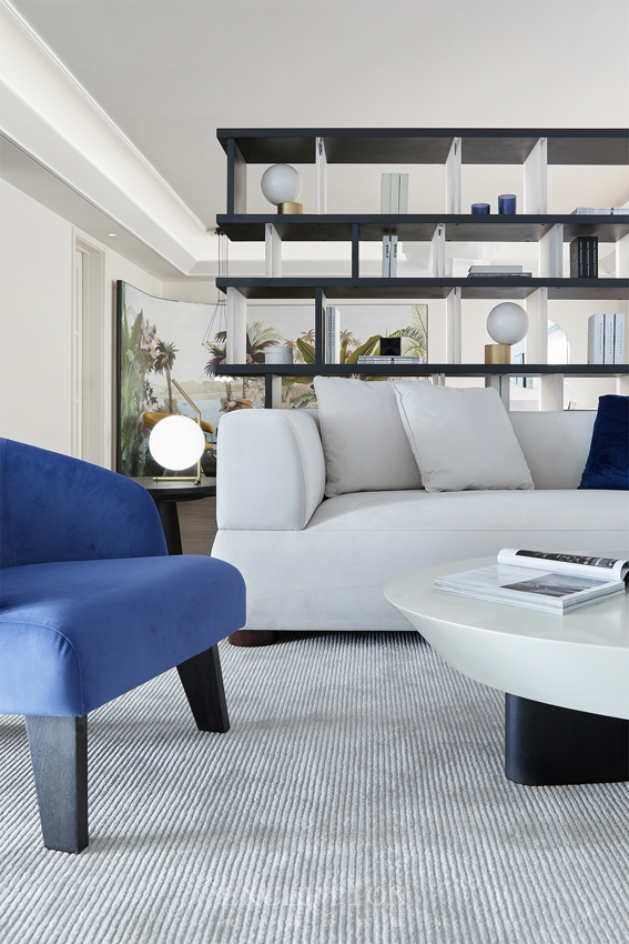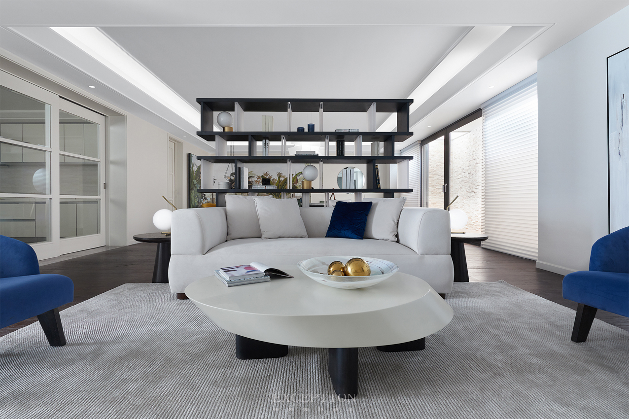 沙發(fā)背后以開(kāi)放式書(shū)架作為隔斷,豐富空間動(dòng)線與層次感,而亞克力材質(zhì)的嵌入將空間映襯得更為朗闊清亮??臻g整體在現(xiàn)代中又透露出藝術(shù)的風(fēng)貌,純粹之余又擁有璀璨的焦點(diǎn)。