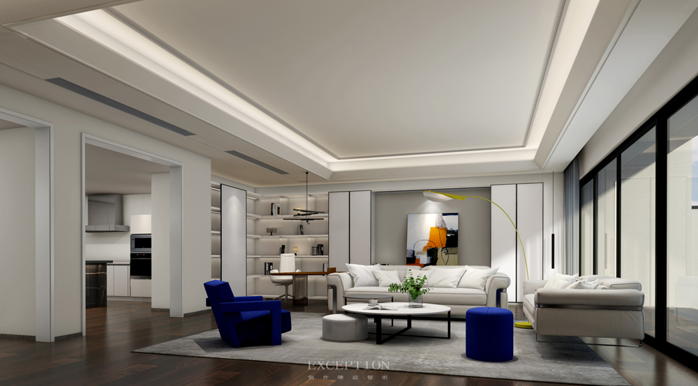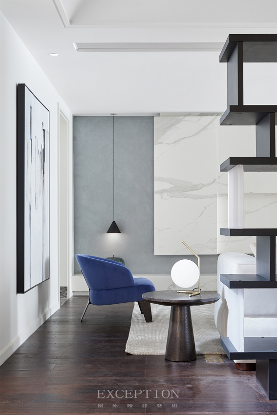休閑廳以乳白的干凈簡(jiǎn)雅作為基底,間以普魯士藍(lán)的優(yōu)雅調(diào)動(dòng)空間氛圍,一幅抽象主義的藝術(shù)掛畫(huà)引起觀者無(wú)限的想象。