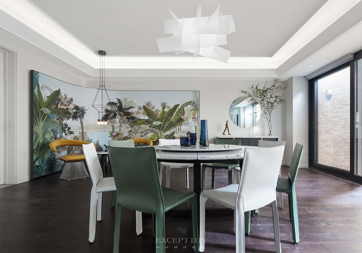 餐廳設(shè)計(jì)在延續(xù)空間主調(diào)的基礎(chǔ)上,融入自然綠意盎然的生姿。熱帶闊葉植物弧形裝飾板,與窗外的蔥翠青松相映襯,一邊是熱鬧明媚的叢林生趣,一邊是清冽靜謐的山崖,迎面散開(kāi)的是樸拙而動(dòng)人的空間氣質(zhì)。明黃色單椅的點(diǎn)綴,洋溢著生活最為明媚的美好。