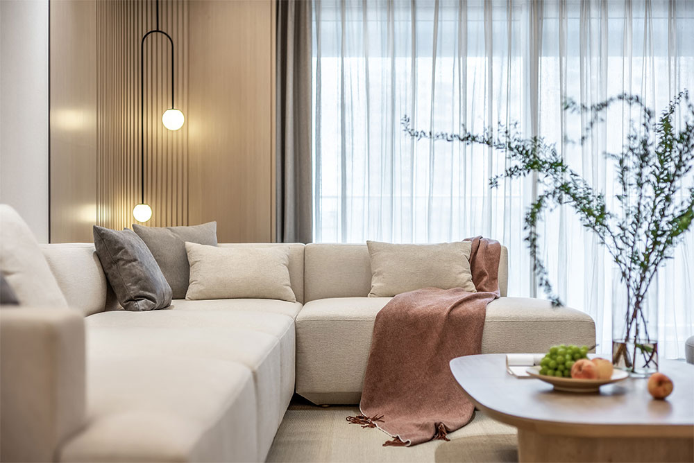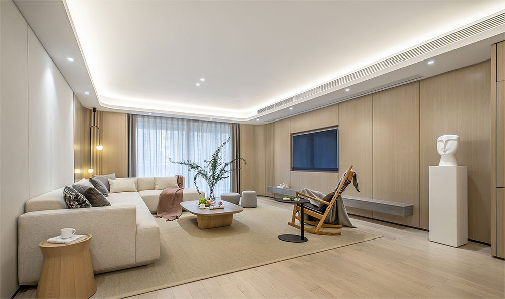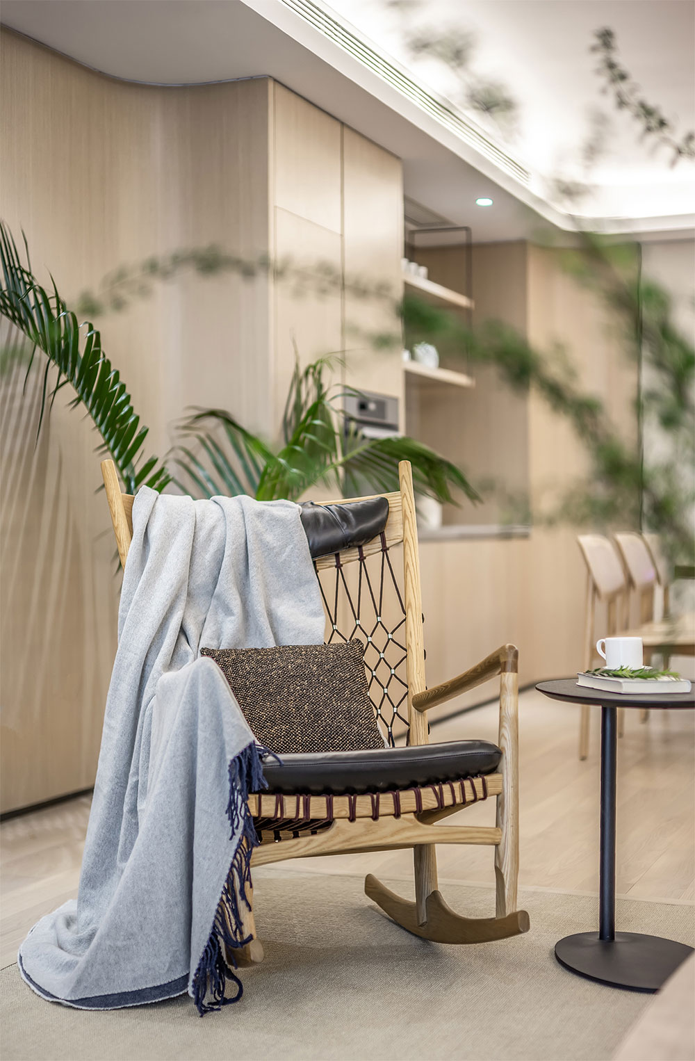客廳以溫暖自然的木色和純凈柔和的米色搭建起交流休憩的日常生活場(chǎng)景,四周木色圓弧設(shè)計(jì)形成包容通暢的圍合感,肌理感劍麻地毯搭配斜紋沙發(fā),串聯(lián)起有關(guān)理想生活的畫面,光著腳感受地毯帶來的massage效果,或是盤腿席地而坐,看書、聊天、和諧美好。