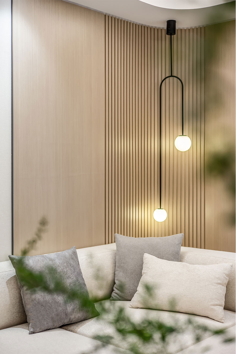 西班牙建筑師安托尼·高迪說:所有的答案都在大自然中。客廳的設(shè)計(jì)讓人聯(lián)想起這番景象:溪水涓涓流淌,風(fēng)乍起,吹皺一汪春水,枝葉隨風(fēng)起舞,風(fēng)邀約幾片新葉水中暢游,從圓溜溜的卵石旁滑過,留下行云流水的水花……一切都是慢悠悠的,回歸自然,私享一種安靜輕松的生活方式。